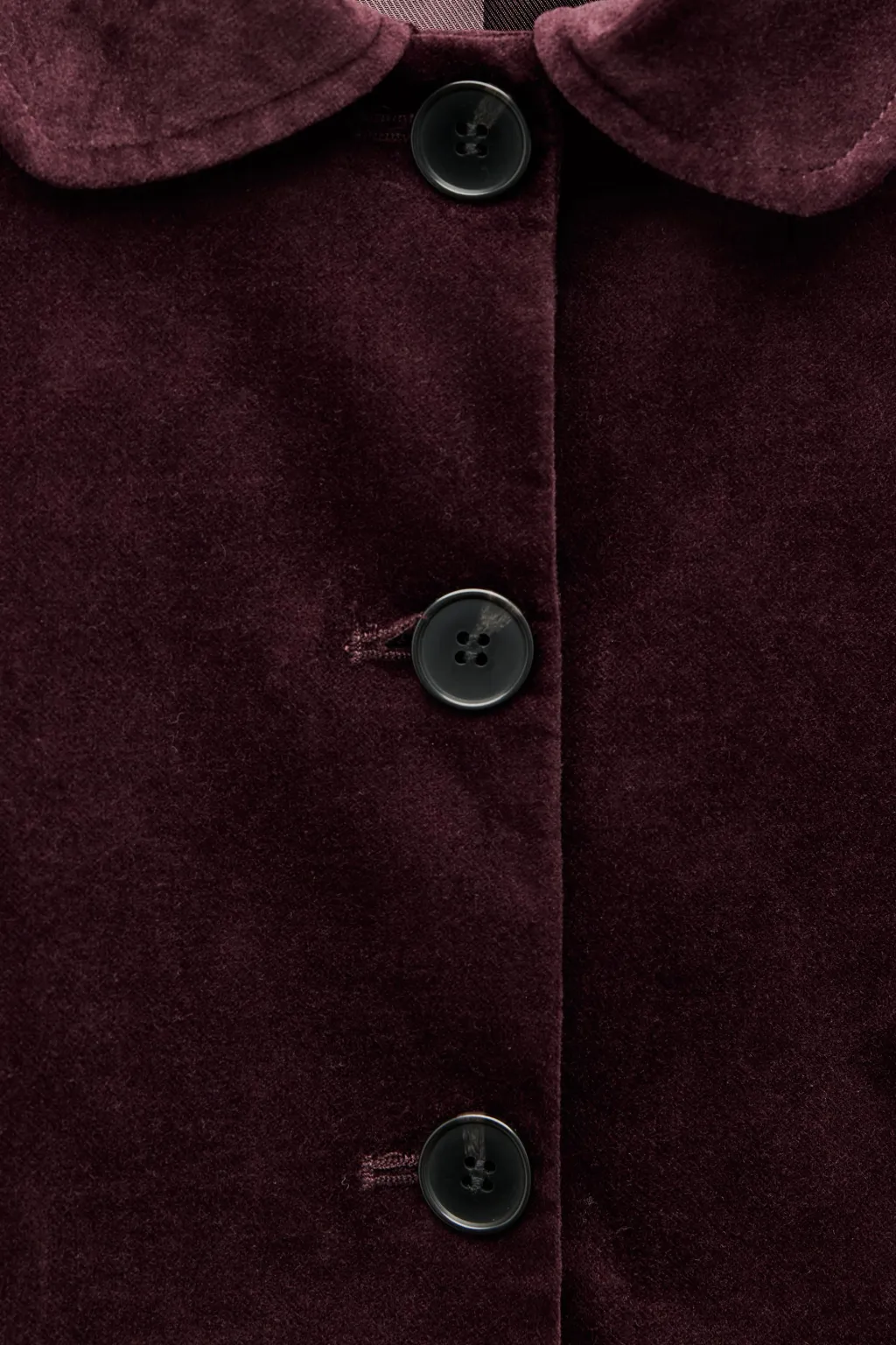 Chaqueta corta de cuello redondo y manga larga con hombreras acabada en vuelta con abertura. Forro interior combinado. Cierre frontal con botones.