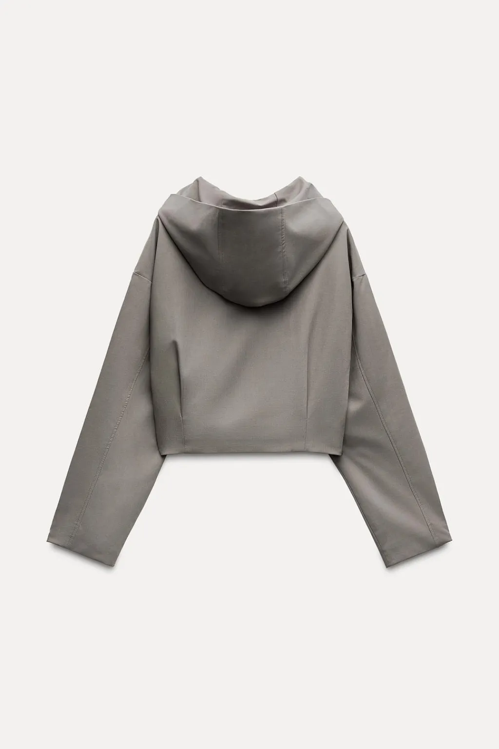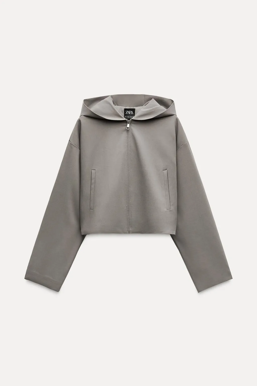 Chaqueta corta con capucha. Manga larga con hombro caído. Bolsillos de vivo en delantero. Forro interior. Cierre frontal con cremallera.