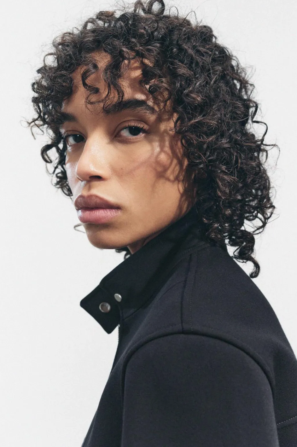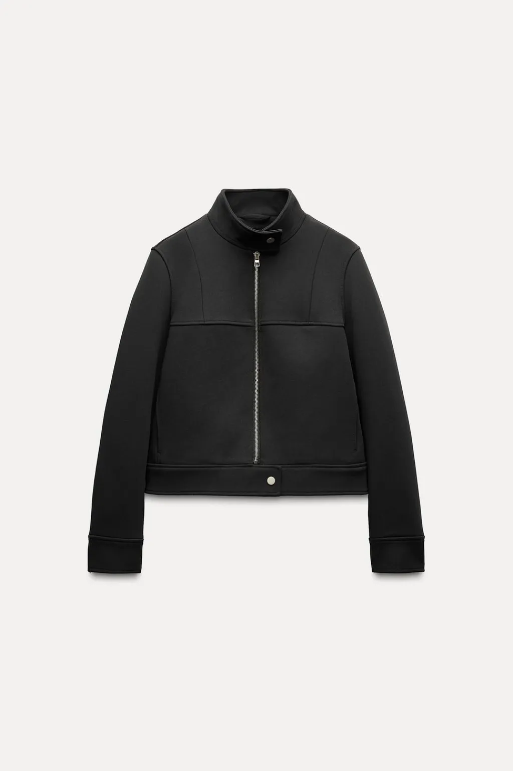 Chaqueta efecto neopreno con cuello perkins y manga larga acabado en puño. Bolsillos delanteros. Cierre frontal con cremallera metálica y botones a presión.