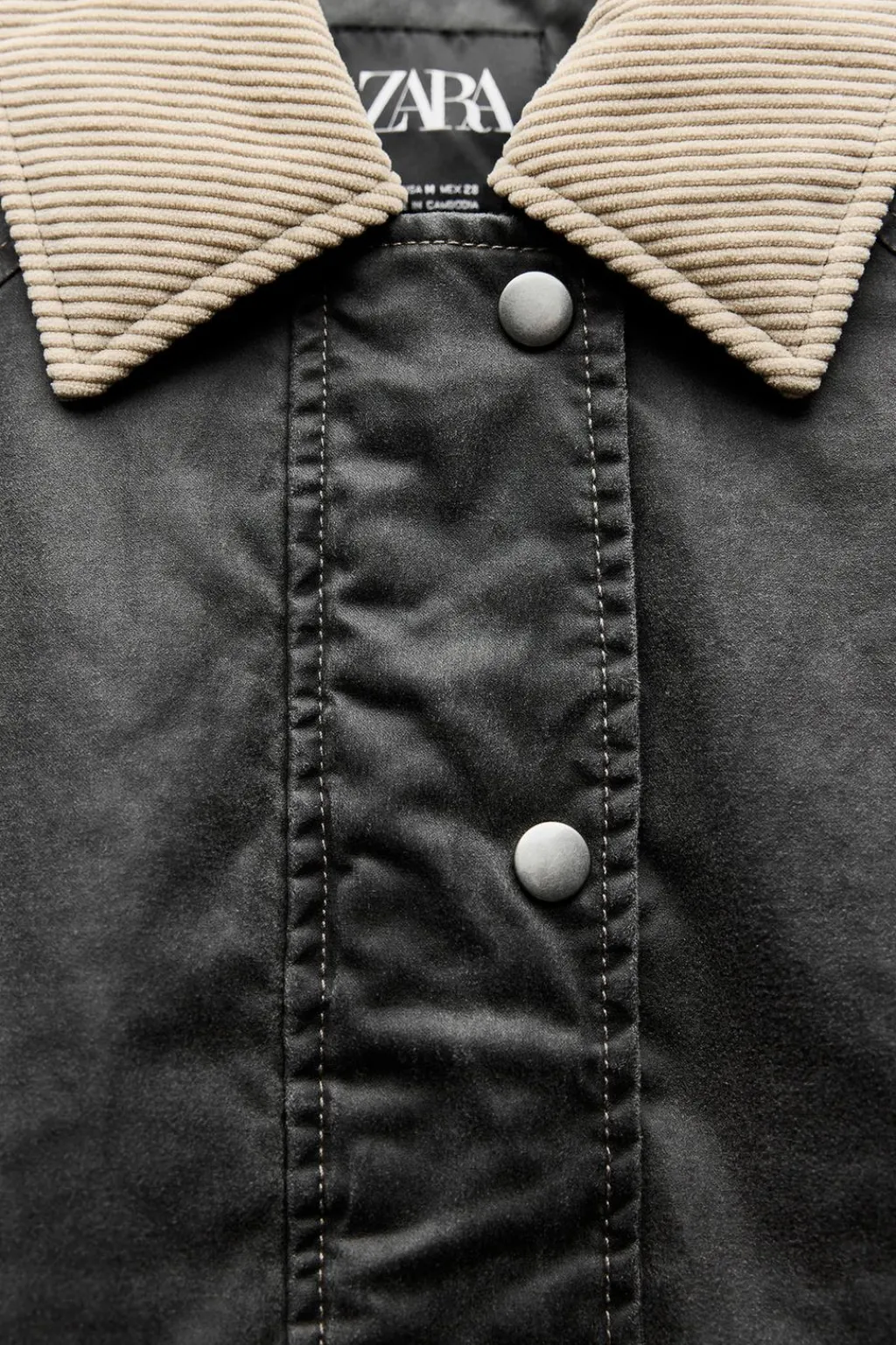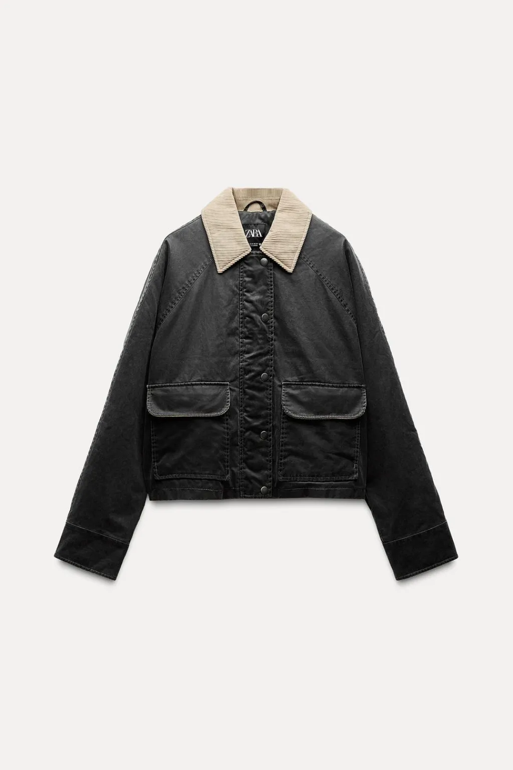 Chaqueta con acolchado interior. Cuello solapa y manga larga acabados en pana a contraste. Bolsillos de plastrón en delantero. Cierre frontal con cremallera y botones a presión.