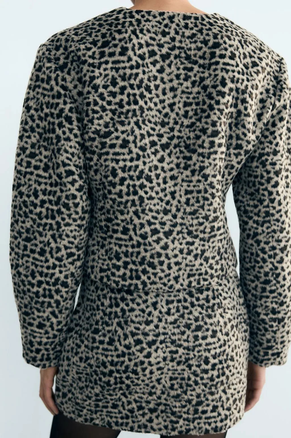 Chaqueta confeccionada en tejido efecto pelo. Cuello redondo y manga larga. Forro interior. Cierre frontal con botones.