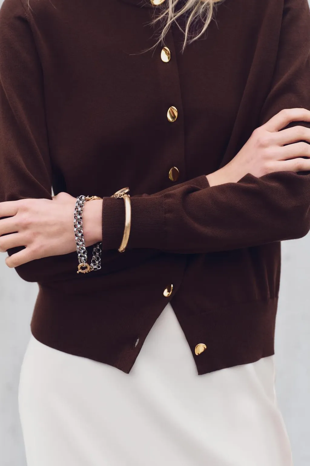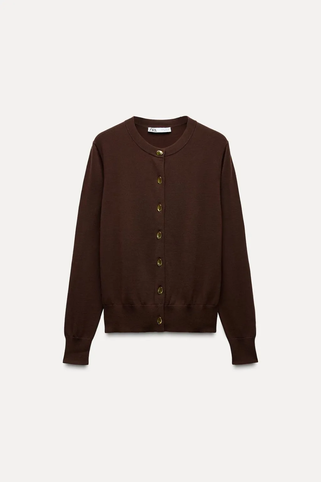 Chaqueta de cuello redondo y manga larga. Cierre frontal con botones dorados.
