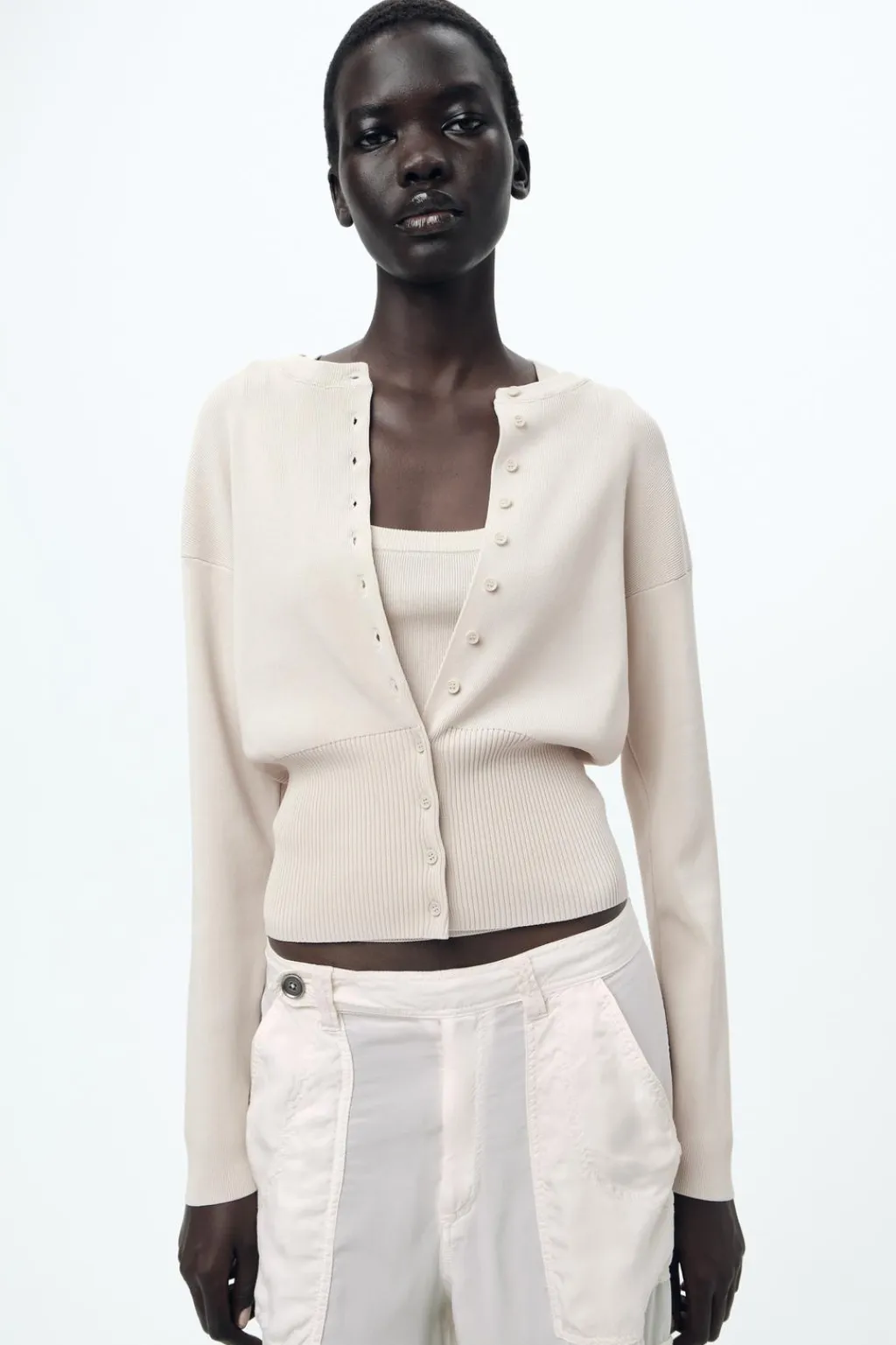 Chaqueta de cuello redondo y manga larga. Detalle de rib ancho en el bajo. Cierre frontal con botones a tono.