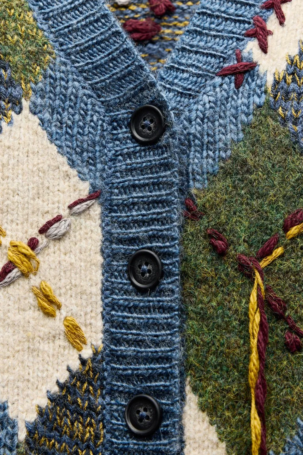 Chaqueta de escote pico y manga larga. Detalle de bordados con flecos. Acabados en rib. Cierre frontal con botones.