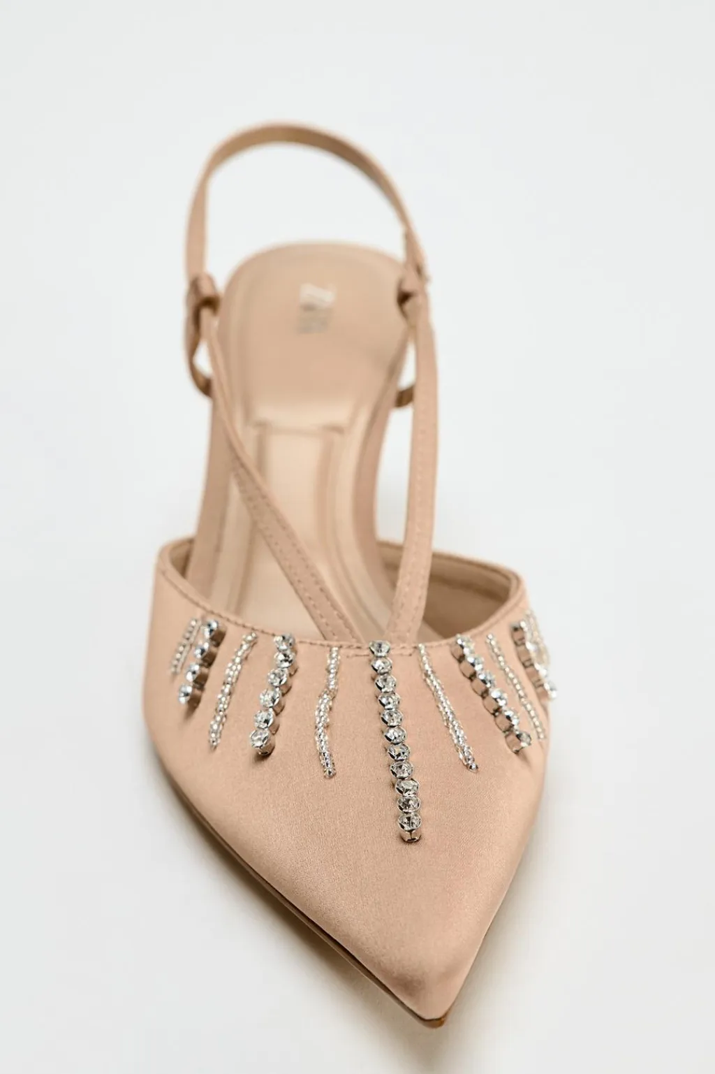 Zapato tipo destalonado tacón. Detalle de pedrería en la parte delantera. Tira trasera ajustable. Acabado en punta.