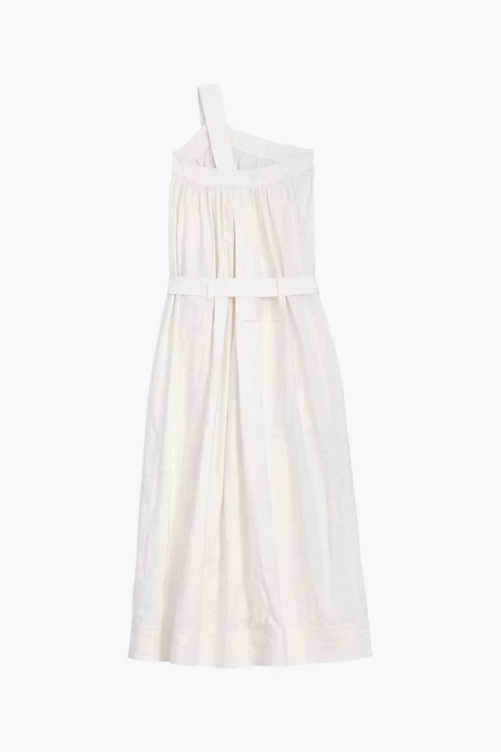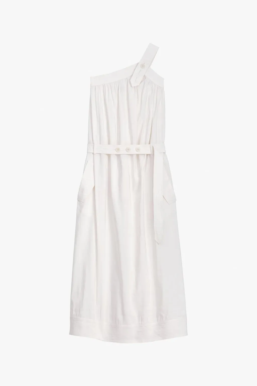 Vestido largo confeccionado en hilatura con lino 37%. Escote asimétrico y tirante ancho con hombros descubiertos. Bolsillos delanteros. Cinturón en mismo tejido ajustable con botones. Detalle de pespuntes marcados combinados a tono.