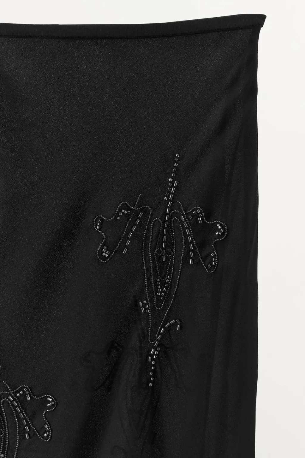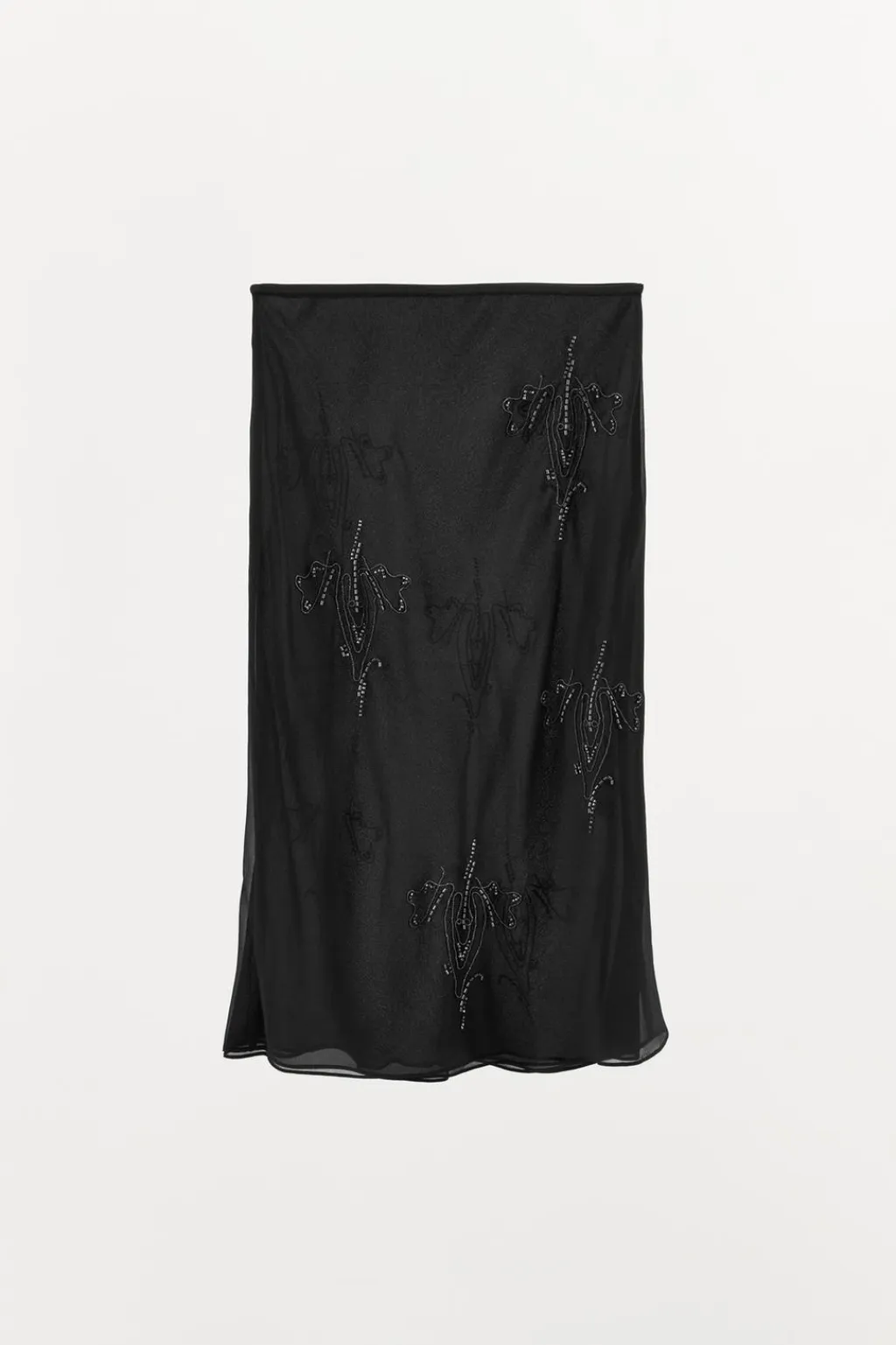 Falda midi de tiro medio y cintura elástica. Detalle aplicación de abalorios en diferentes formas y tamaños combinados a contraste. Forro interior a tono.