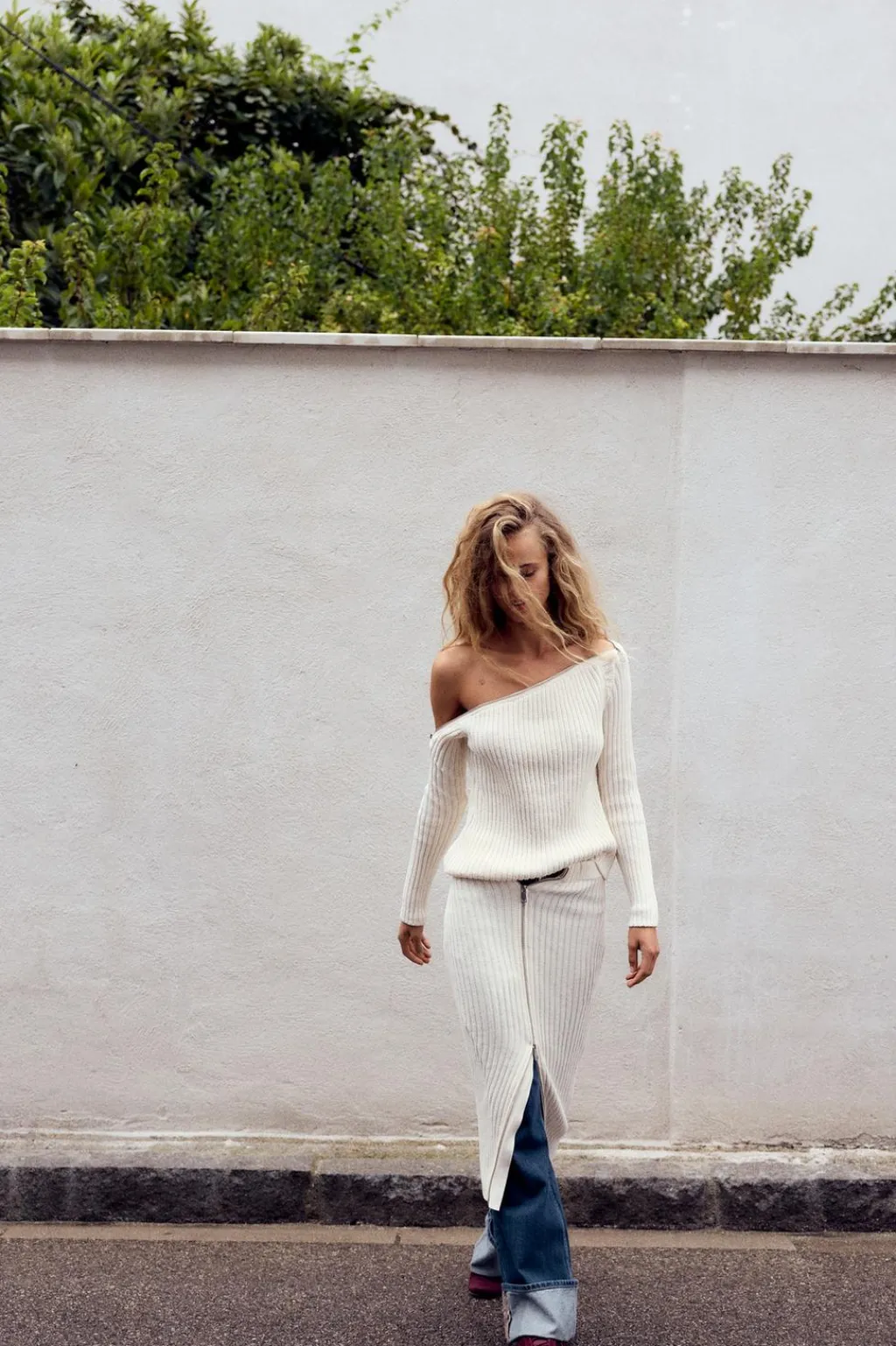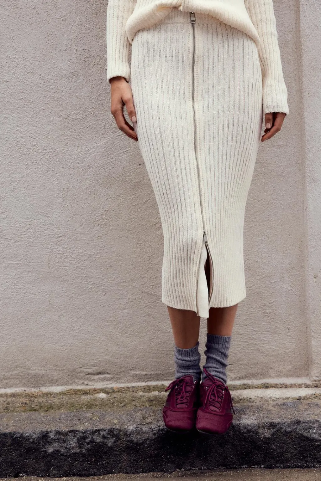 Falda midi de tiro alto con cintura elástica. Cierre frontal con cremallera metálica.