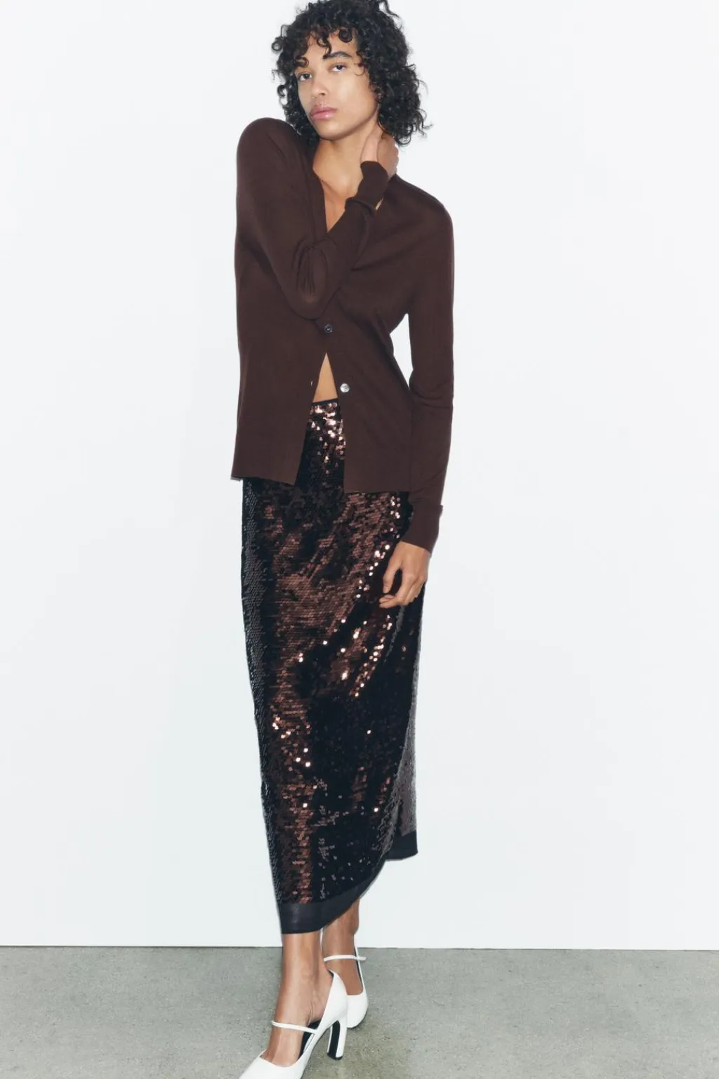 Falda midi de tiro alto. Detalle de aplicación de lentejuelas. Forro interior. Cierre con cremallera oculta en costura.