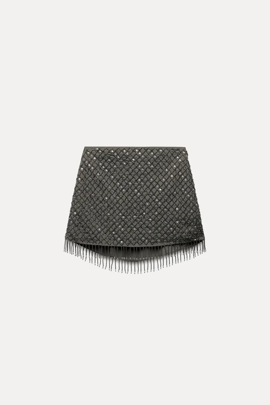 Falda mini de tiro medio con cremallera lateral oculta en costura. Detalle aplicación de abalorios y lentejuelas. Bajo acabado en flecos con abalorios.