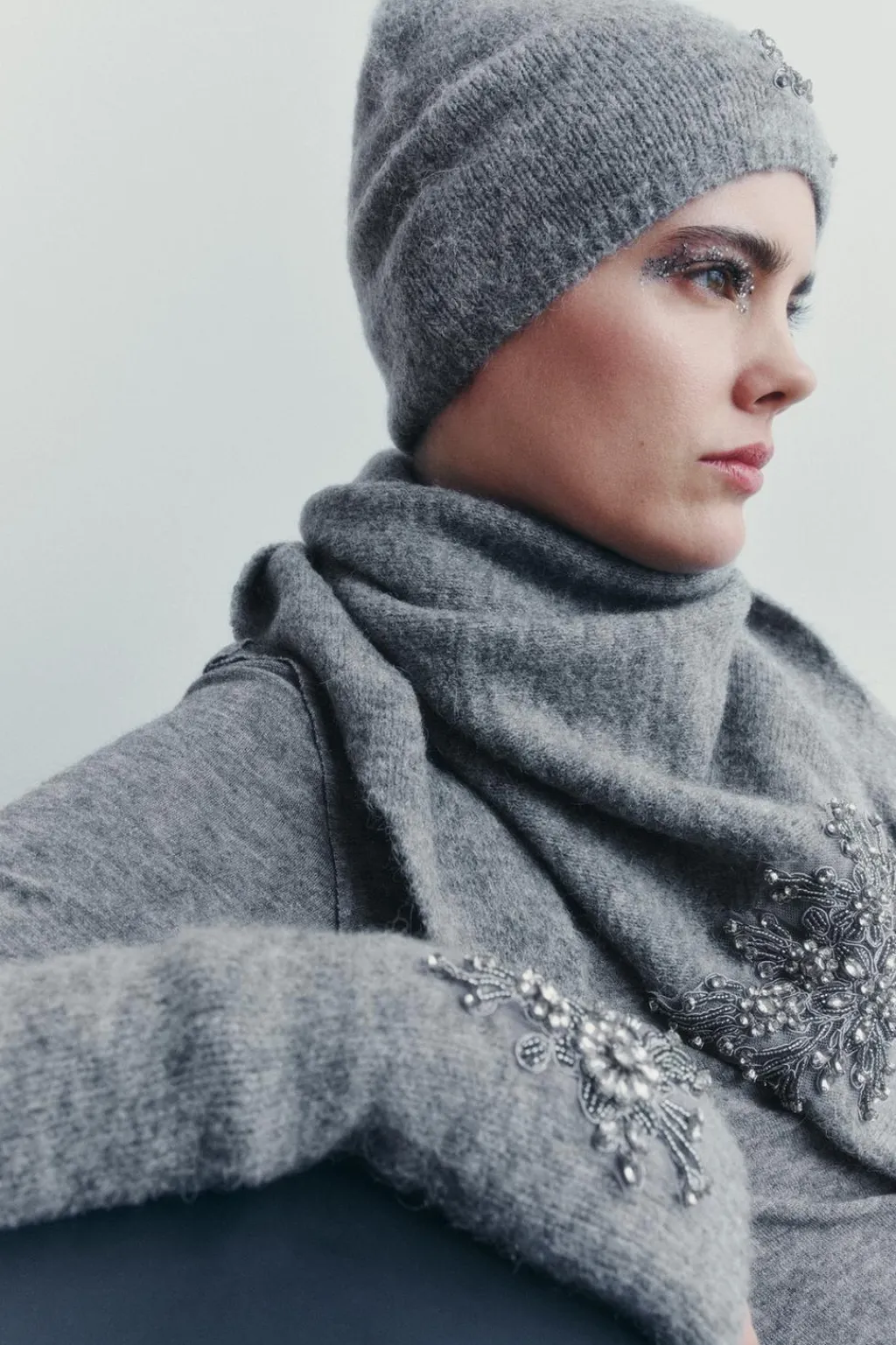Gorro tipo beanie confeccionado con lana 14% y alpaca 14%. Detalle de bordados florales y aplicación de abalorios y joyas combinados a contraste.