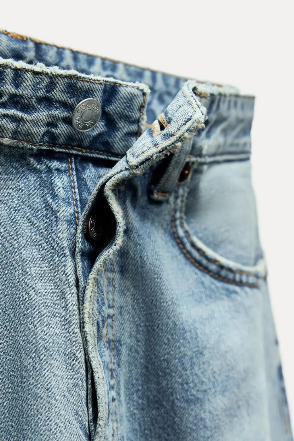 Jeans de tiro medio con cinco bolsillos. Efecto lavado. Cierre frontal con botones.