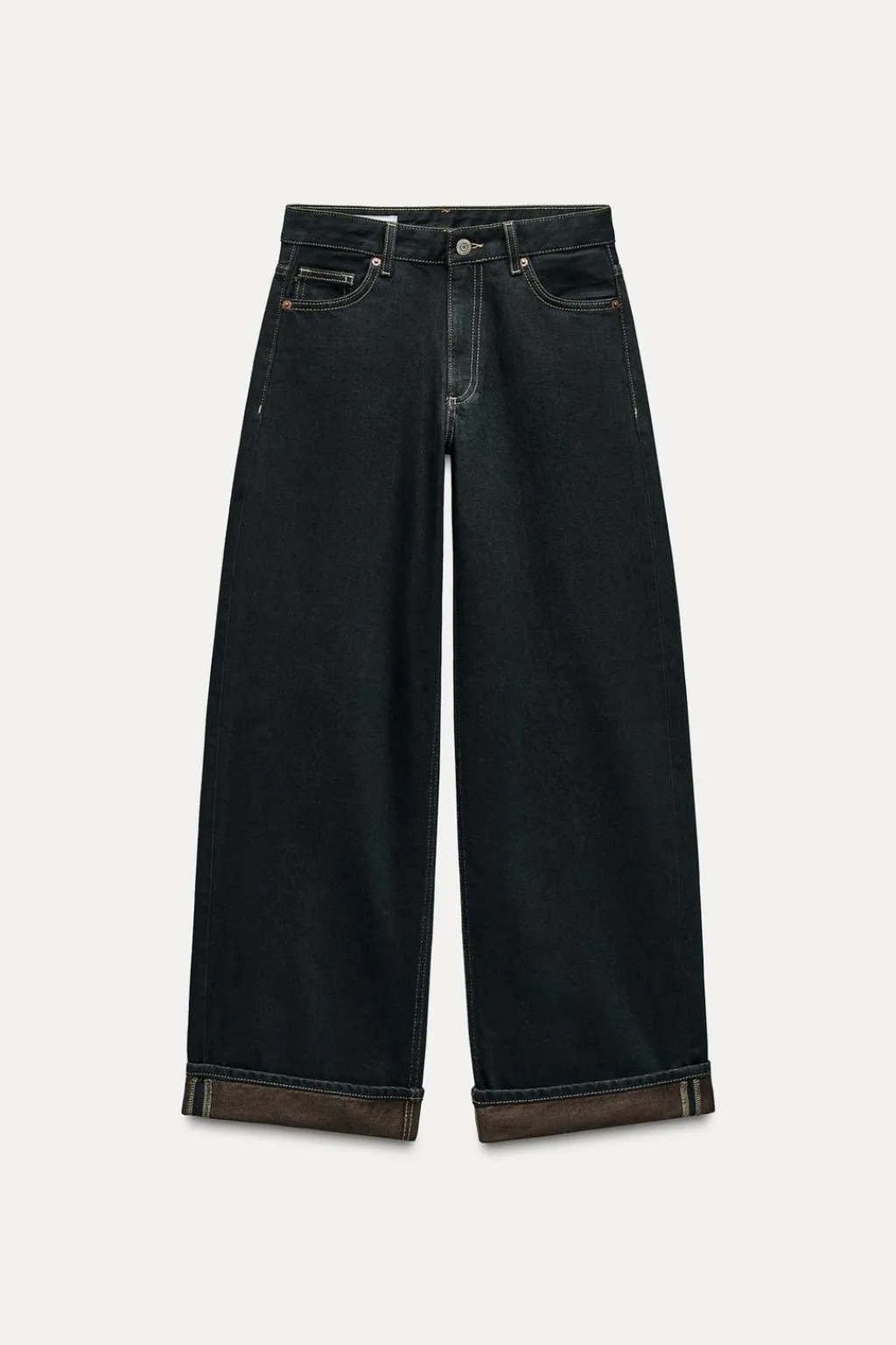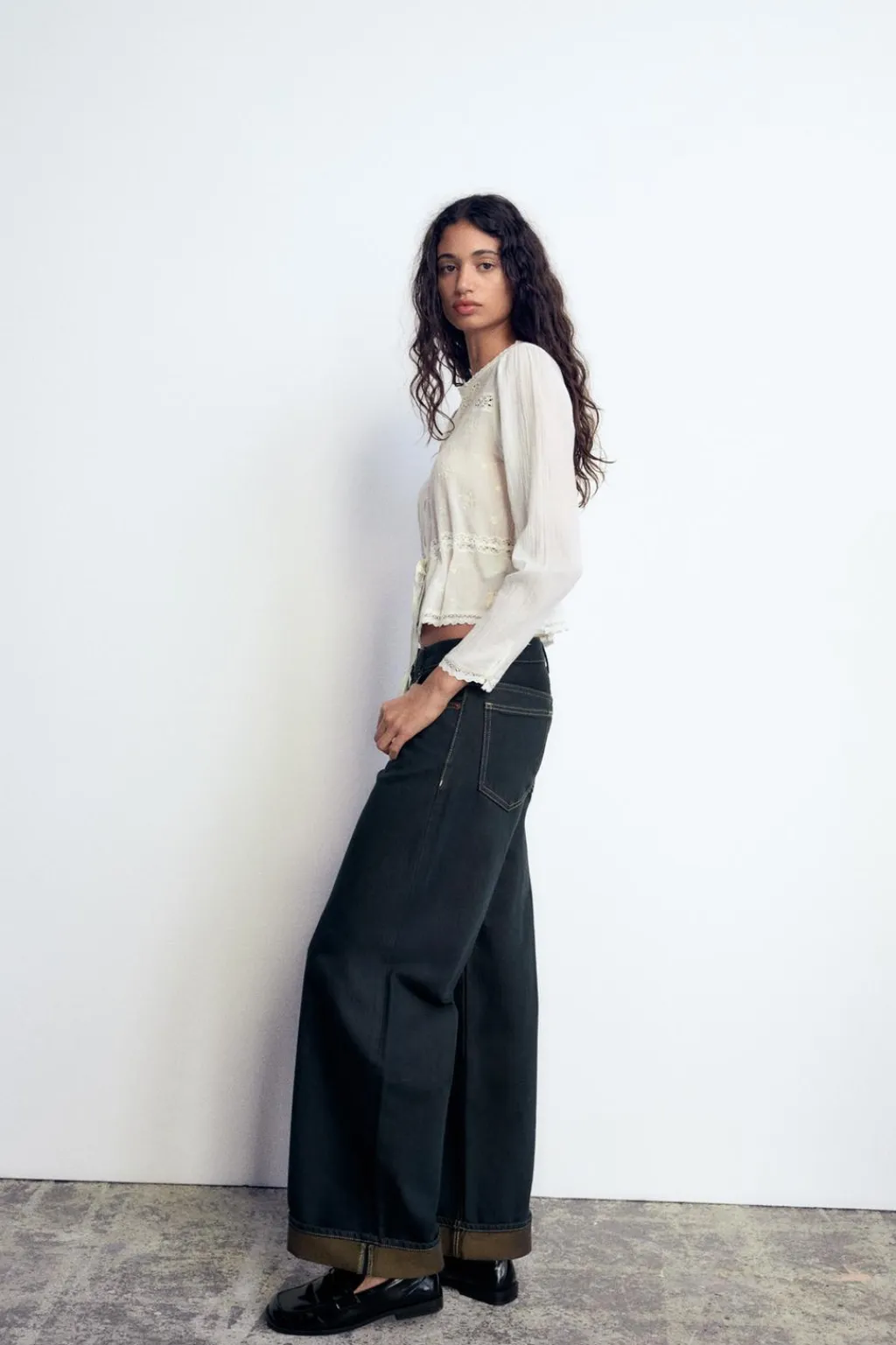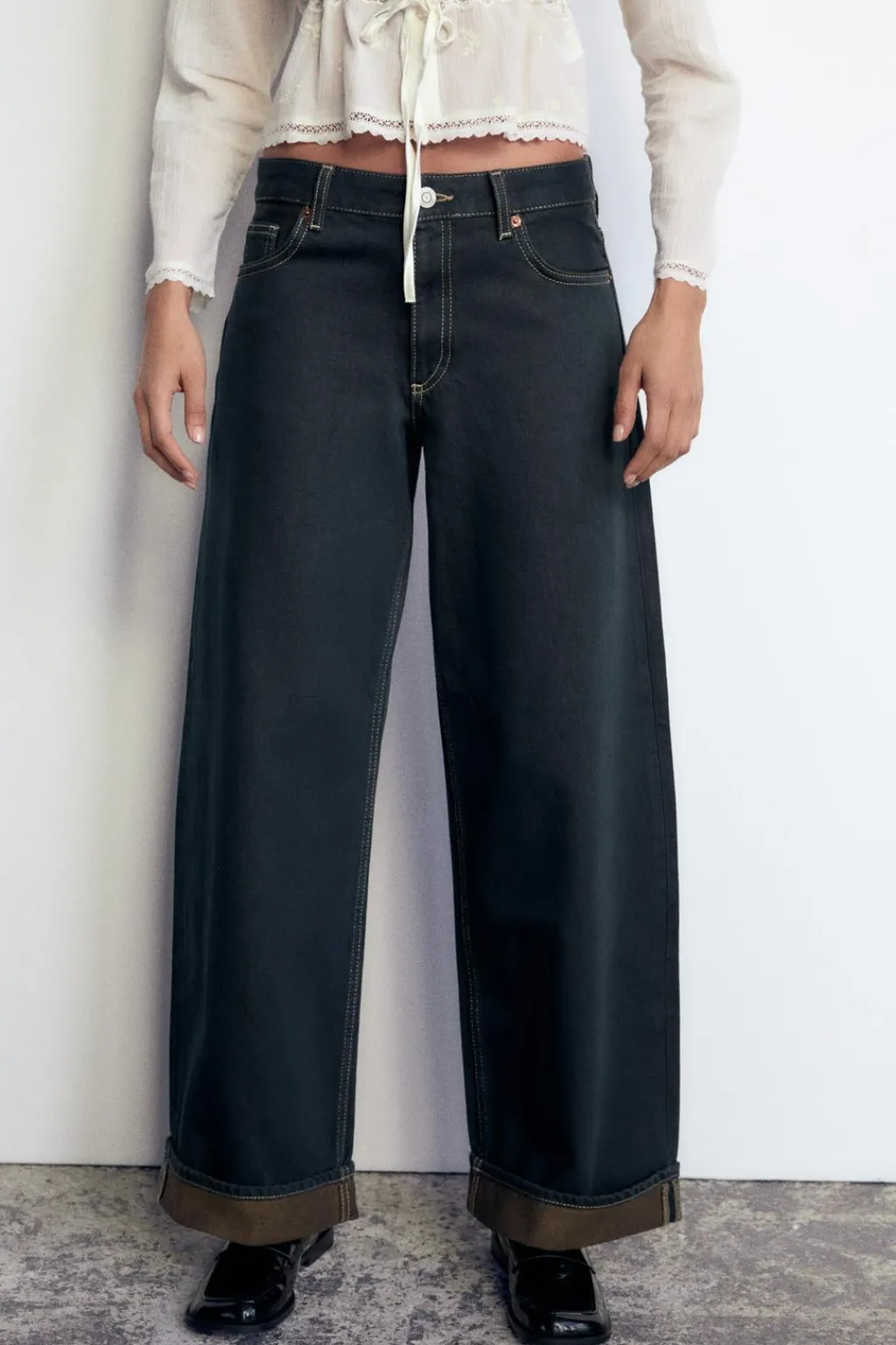 Jeans de tiro bajo con trabillas y cinco bolsillos. Bajo acabado en vuelta. Cierre frontal con cremallera y botón metálico.