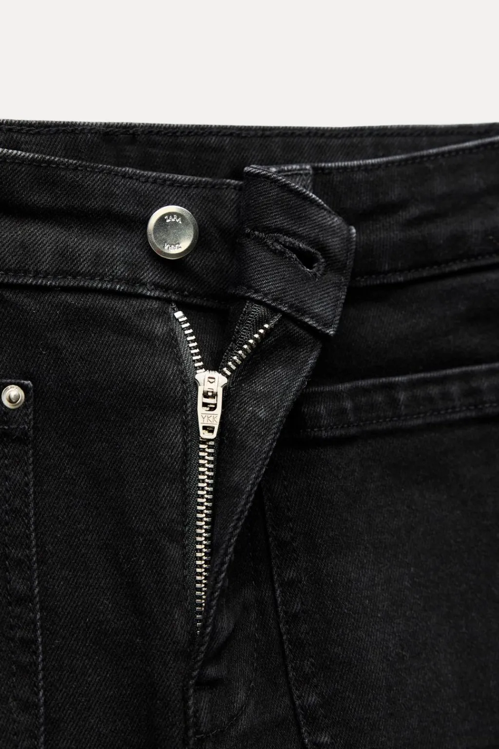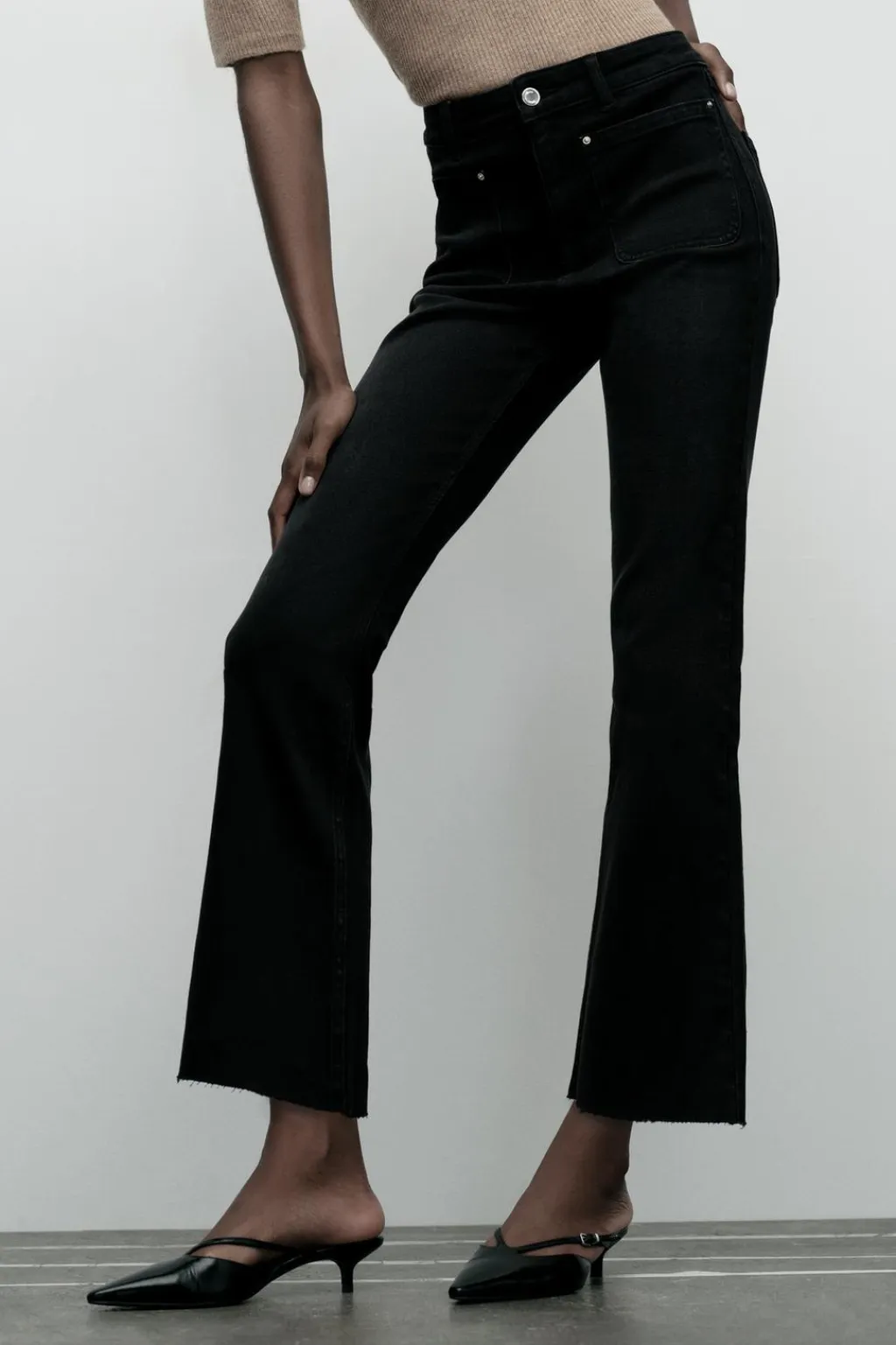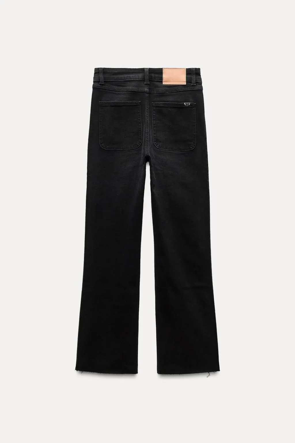 Jeans tobilleros de tiro alto con bolsillos de plastrón en delantero y espalda. Efecto lavado. Bajo en evasé con acabado sin costura. Cierre frontal con cremallera y botón.