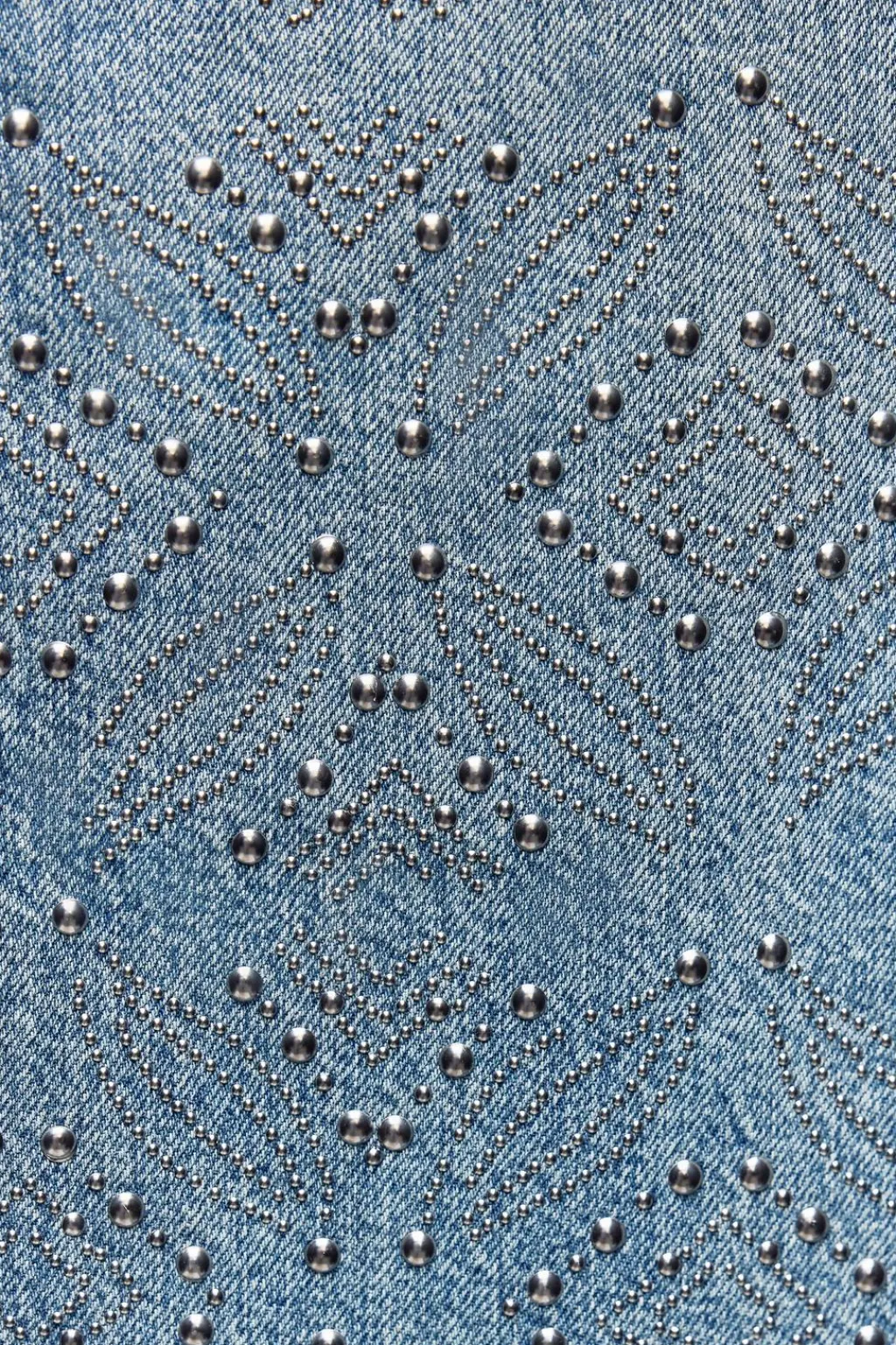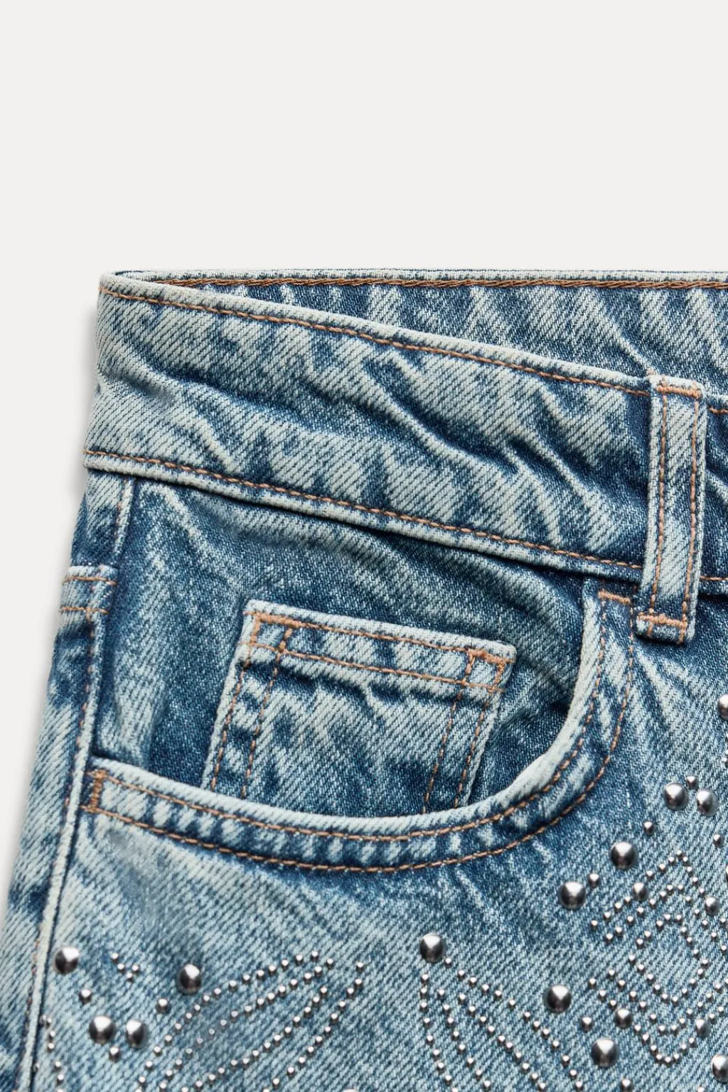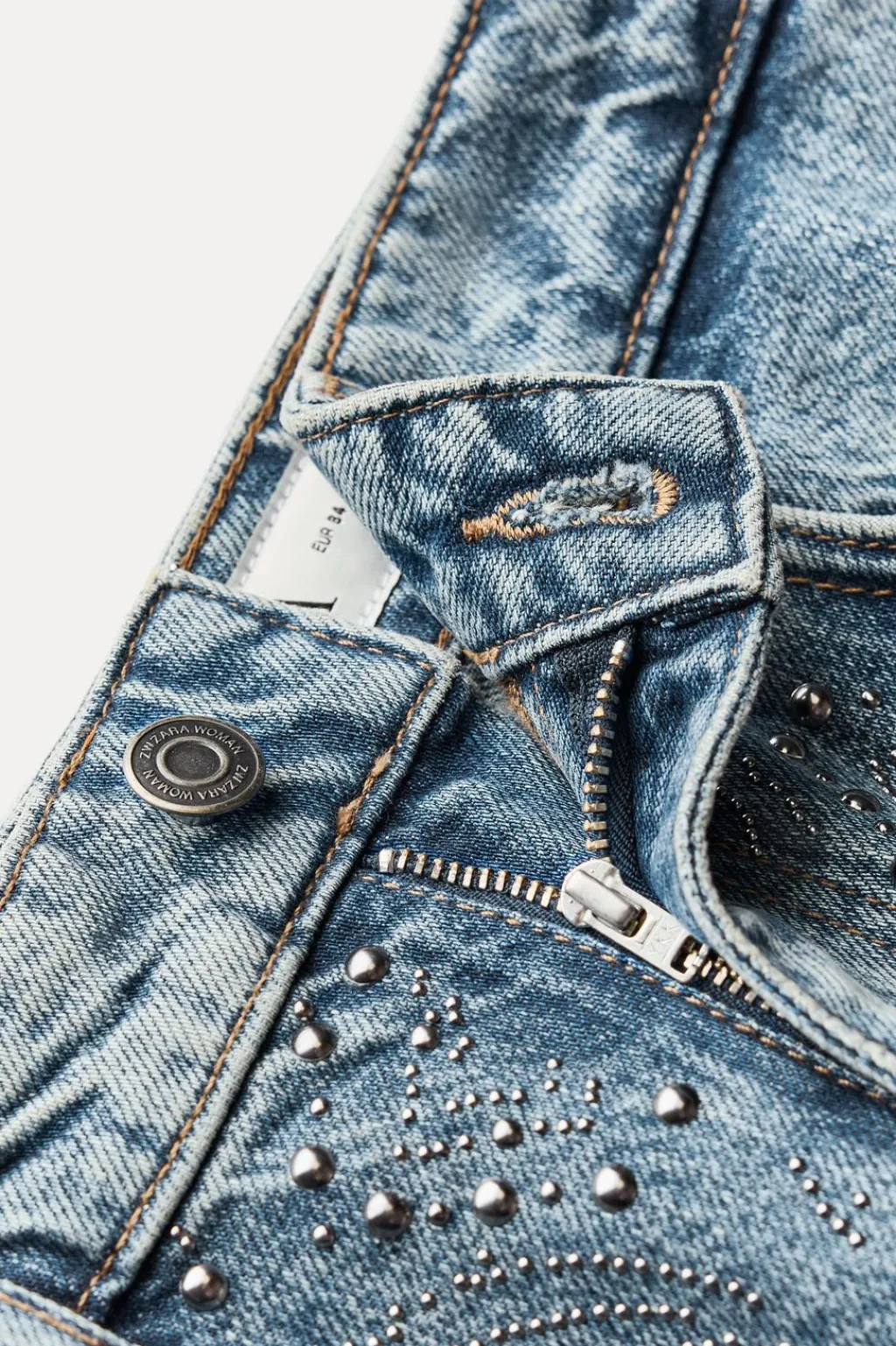 Jeans de tiro medio y cintura con trabillas. Cinco bolsillos. Detalle de aplicación de tachas. Pierna recta. Cierre frontal con cremallera y botón.