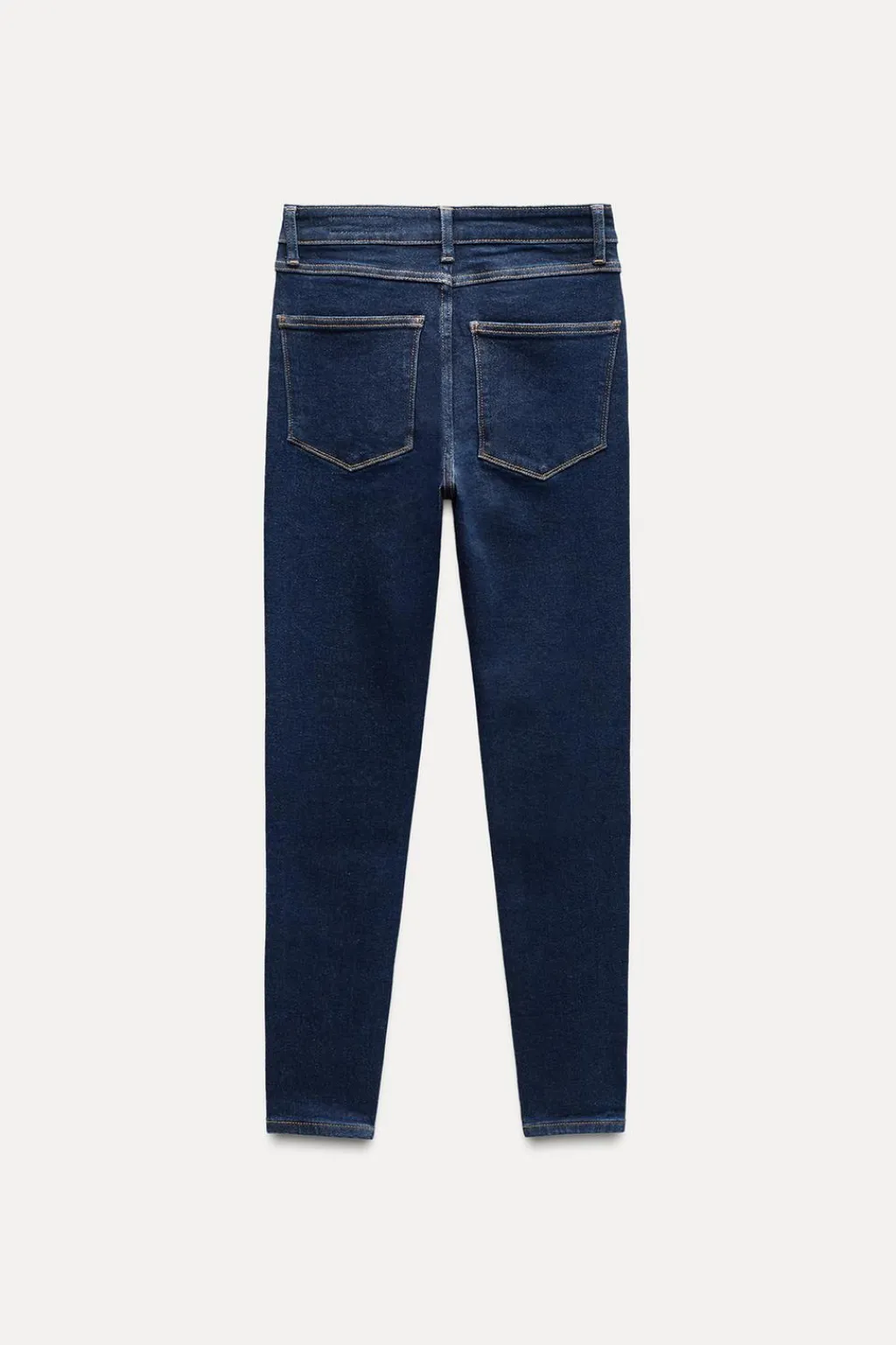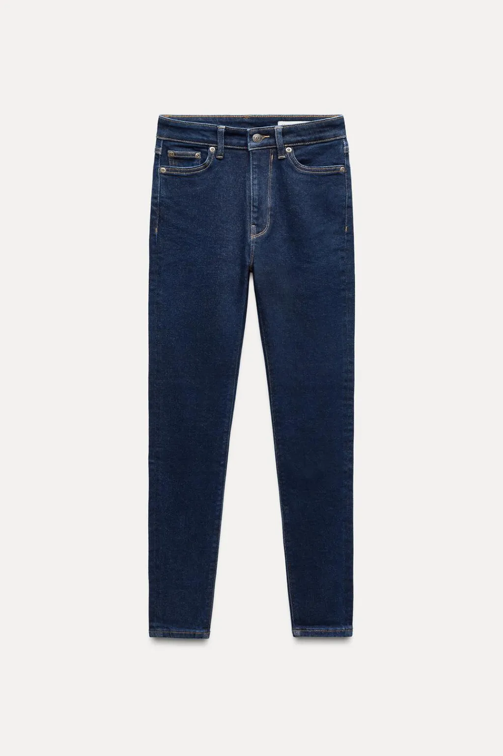 Jeans de tiro alto y cintura con trabillas. Cinco bolsillos. Detalle de pespuntes marcados a contraste. Cierre frontal con cremallera y botón metálico.