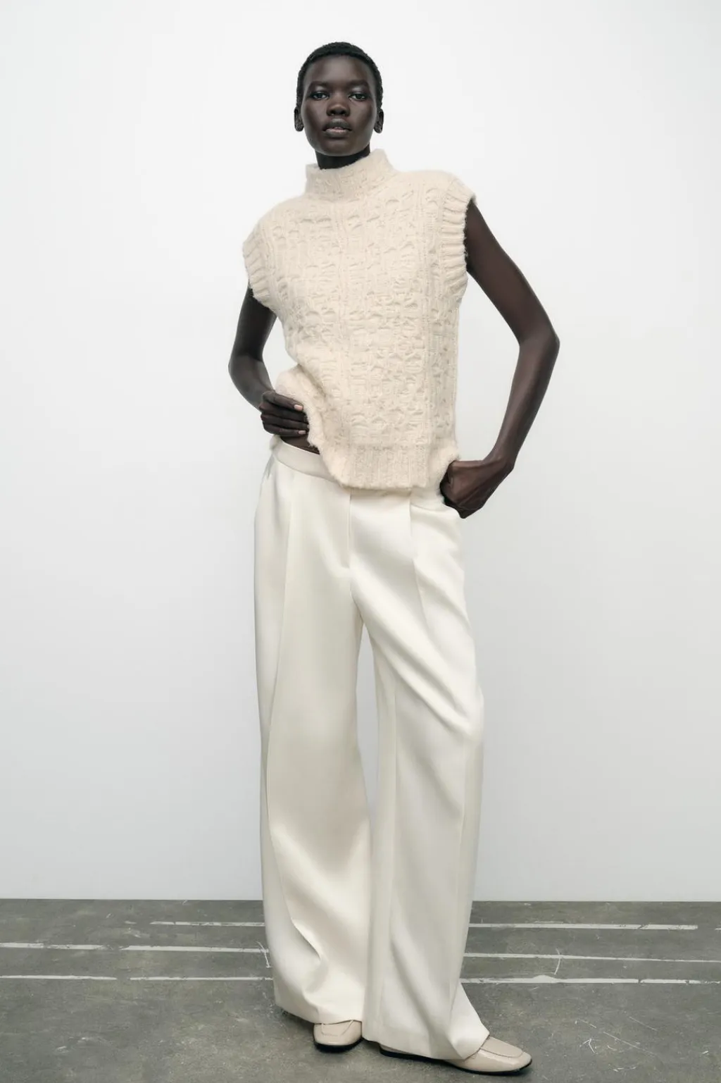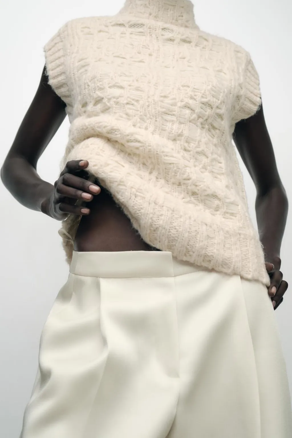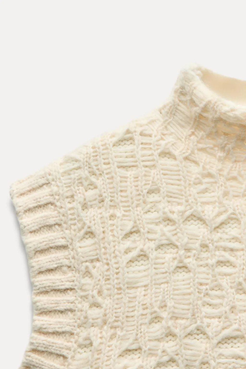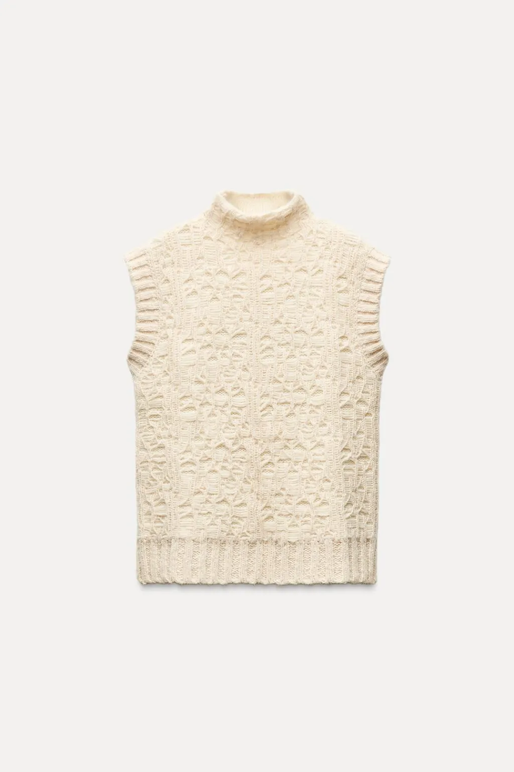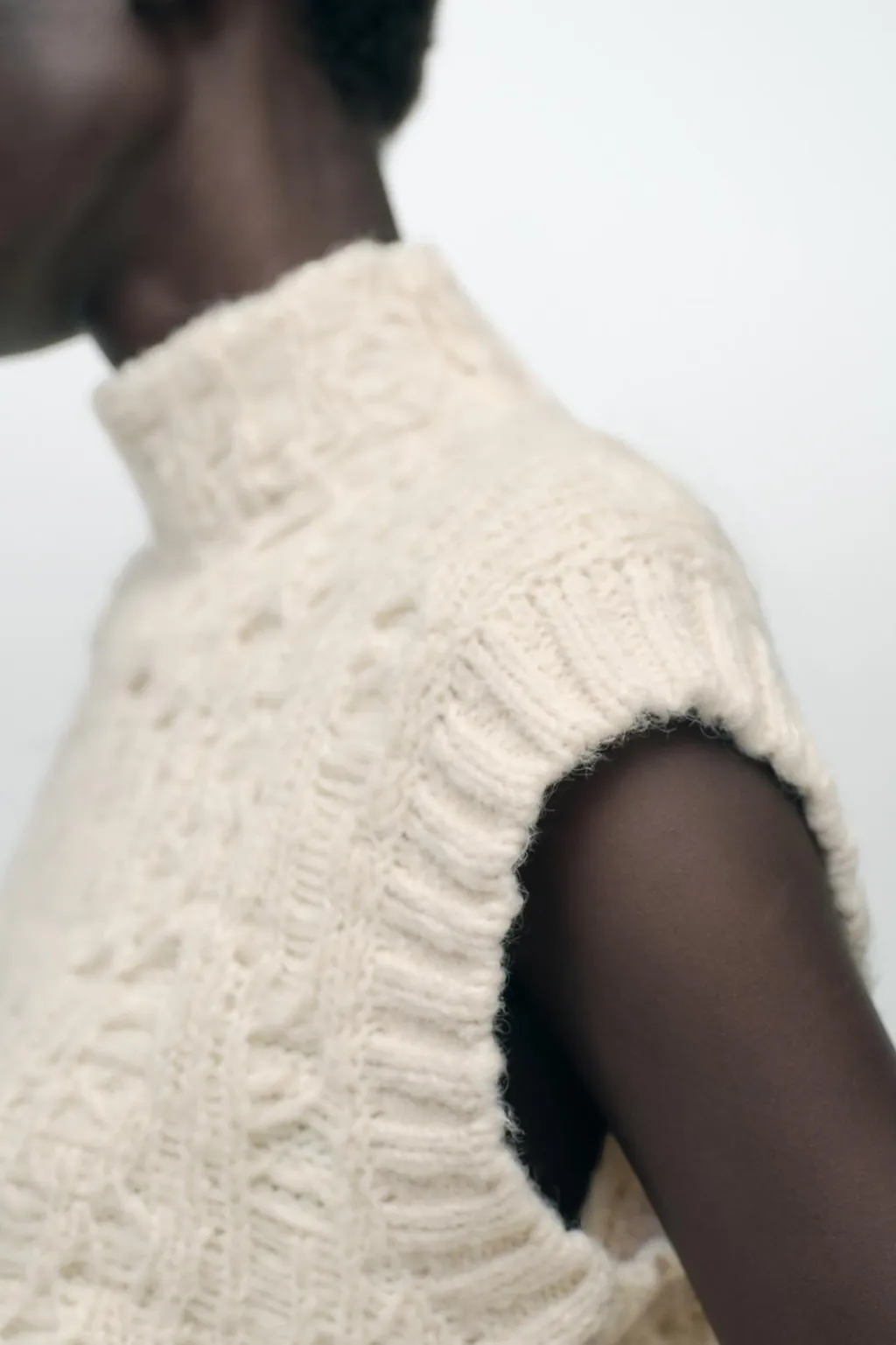 Jersey chaleco de cuello subido y manga sisa. Bajo con aberturas laterales. Acabados en rib.