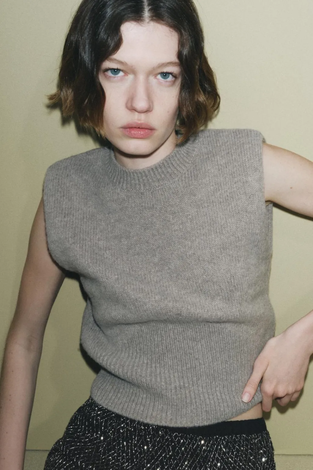 Jersey chaleco confeccionado en hilatura con lana. Cuello redondo y manga sisa. Acabados en rib a tono.