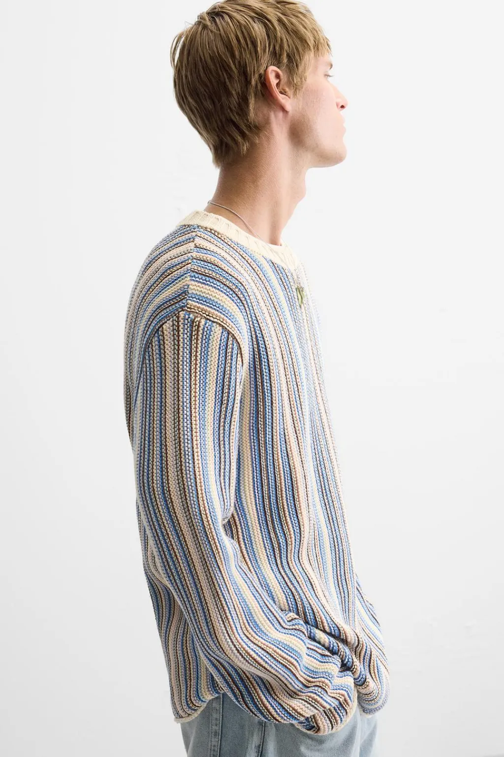 Jersey relaxed fit. Cuello redondo manga larga. Acabados irregulares.