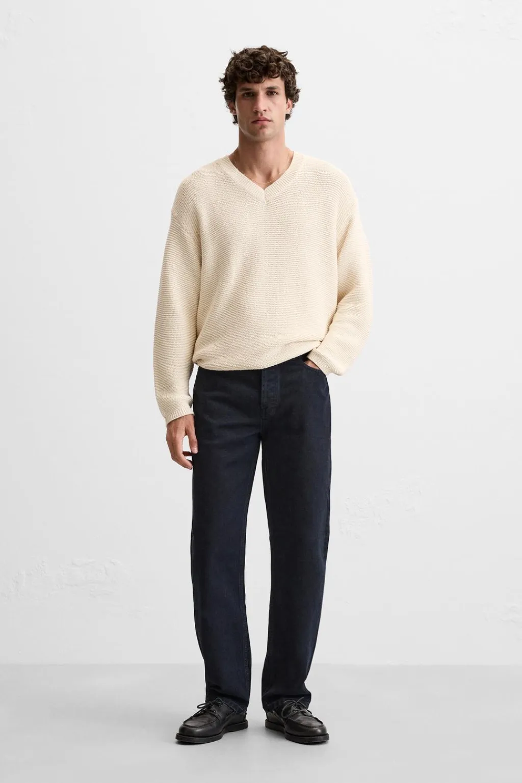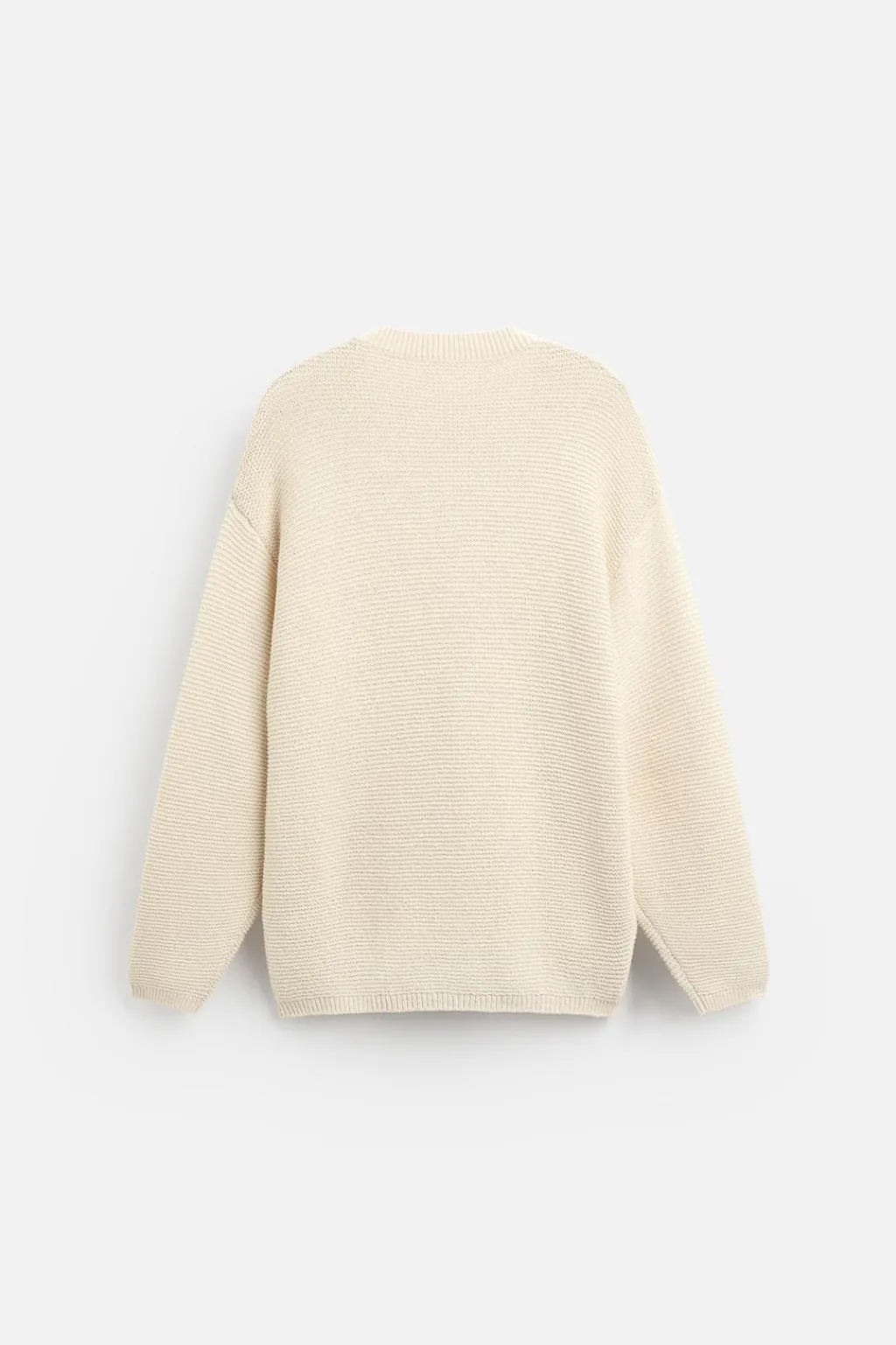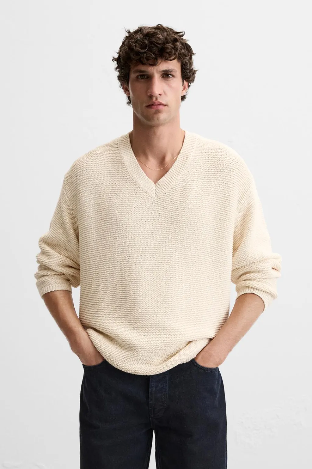 Jersey relaxed fit tejido en hilatura con algodón. Cuello pico y manga larga. Acabados en rib.