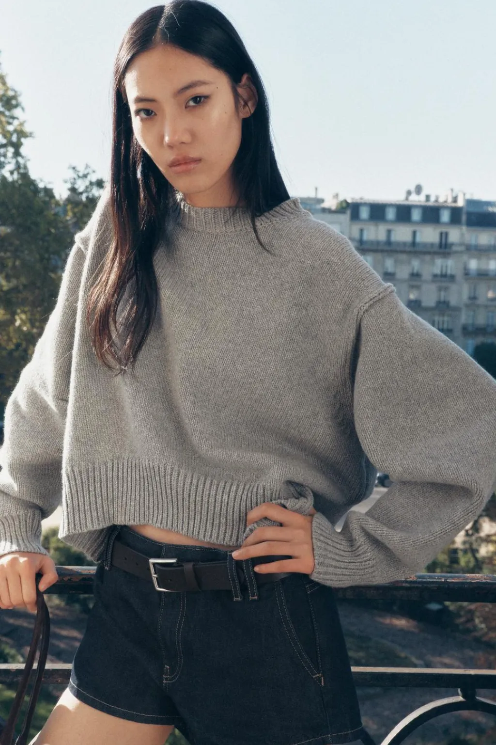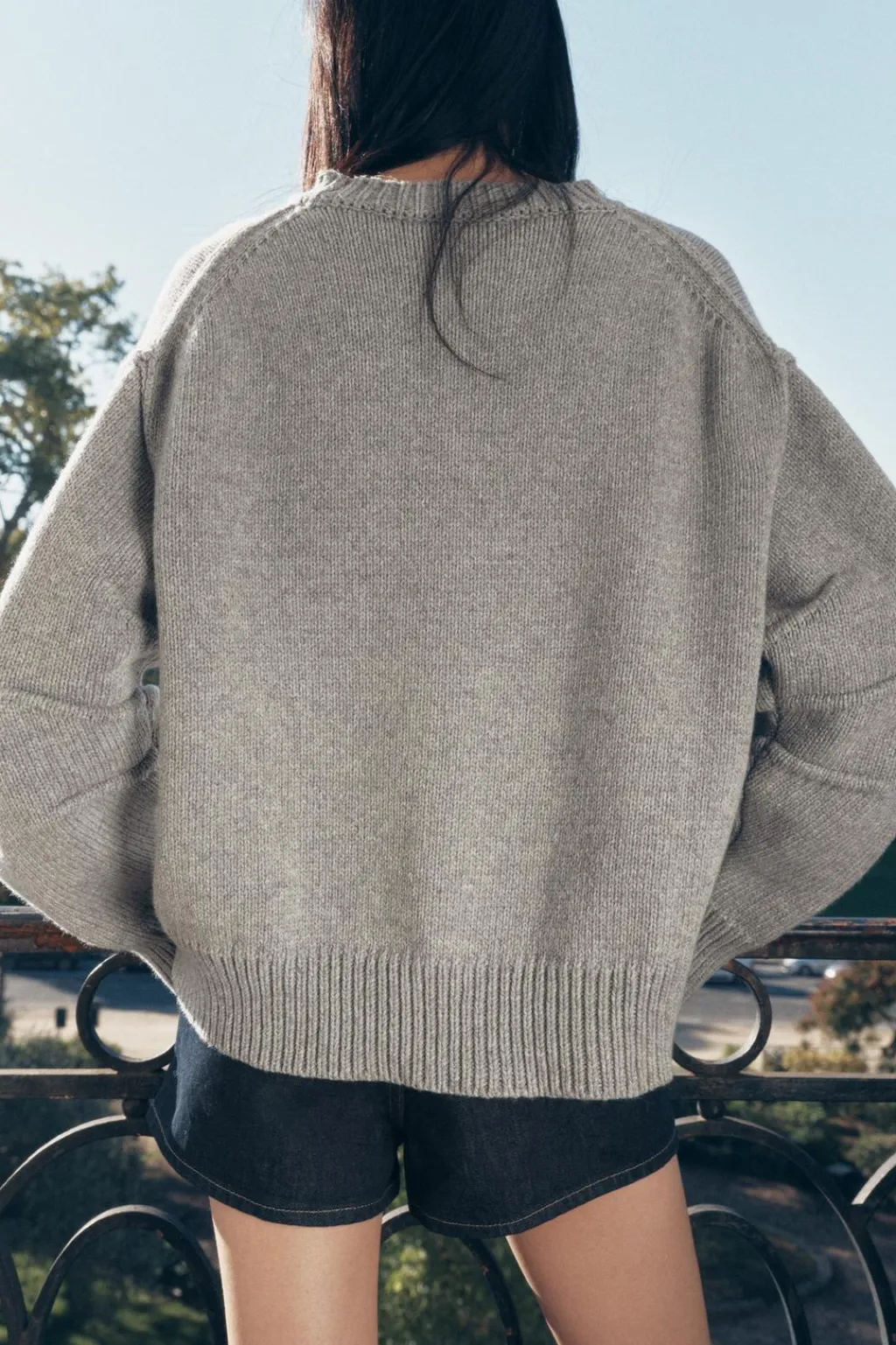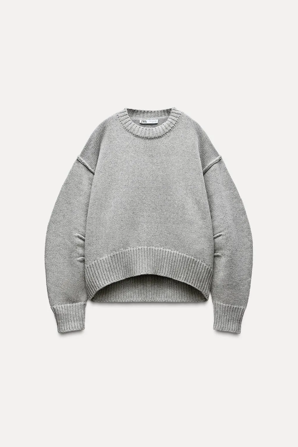 Jersey de cuello redondo y manga larga con pliegues. Bajo asimétrico. Acabados en rib.