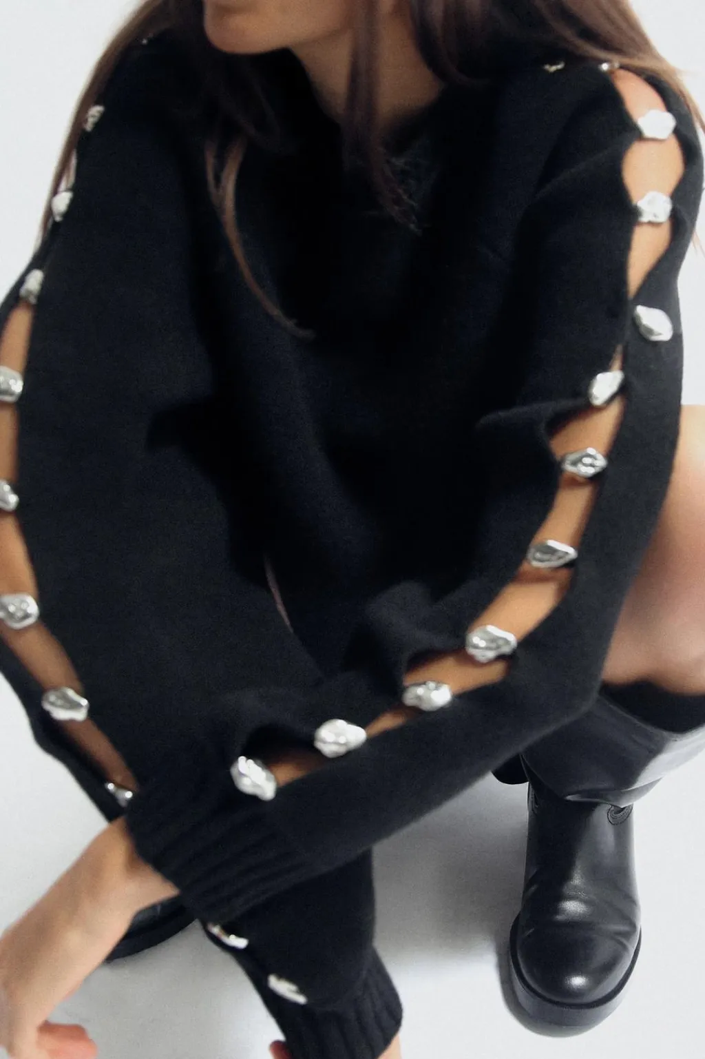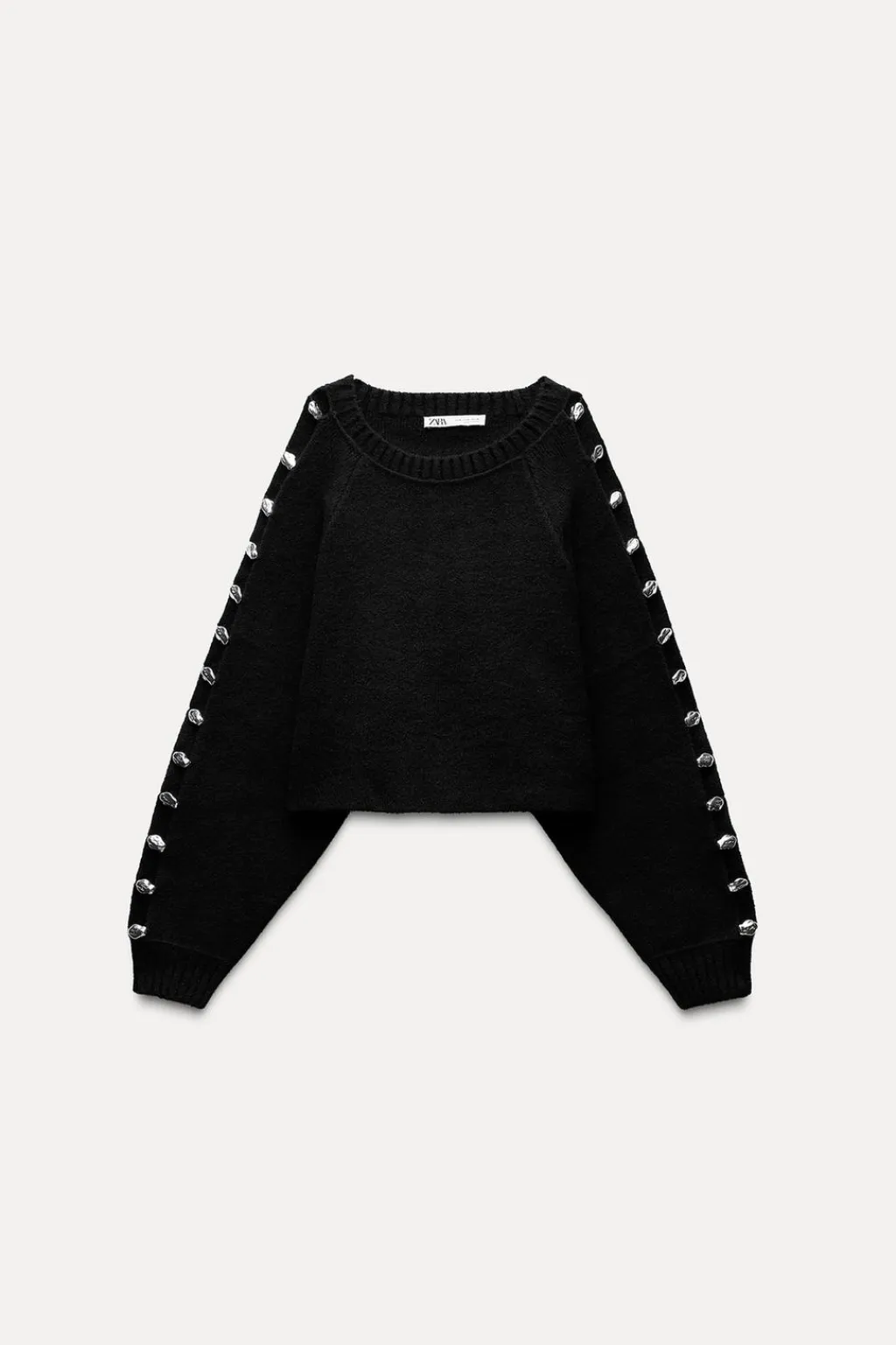 Jersey de cuello redondo y manga larga con aberturas y aplicación de bolas metálicas. Acabados en rib.