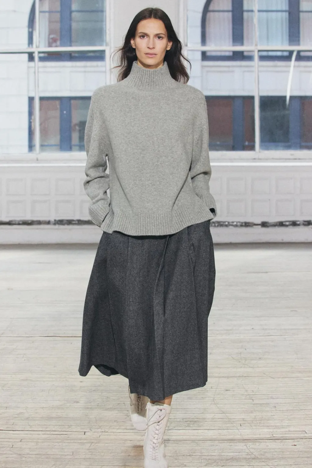 Jersey de punto liso con cuello subido y manga larga. Bajo con aberturas laterales. Acabados en rib.