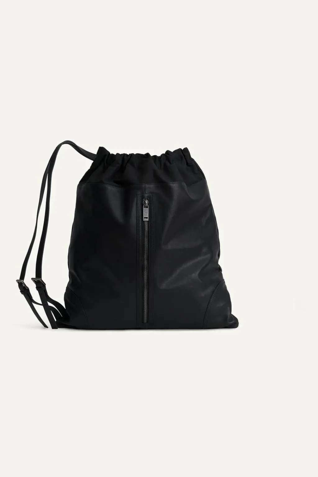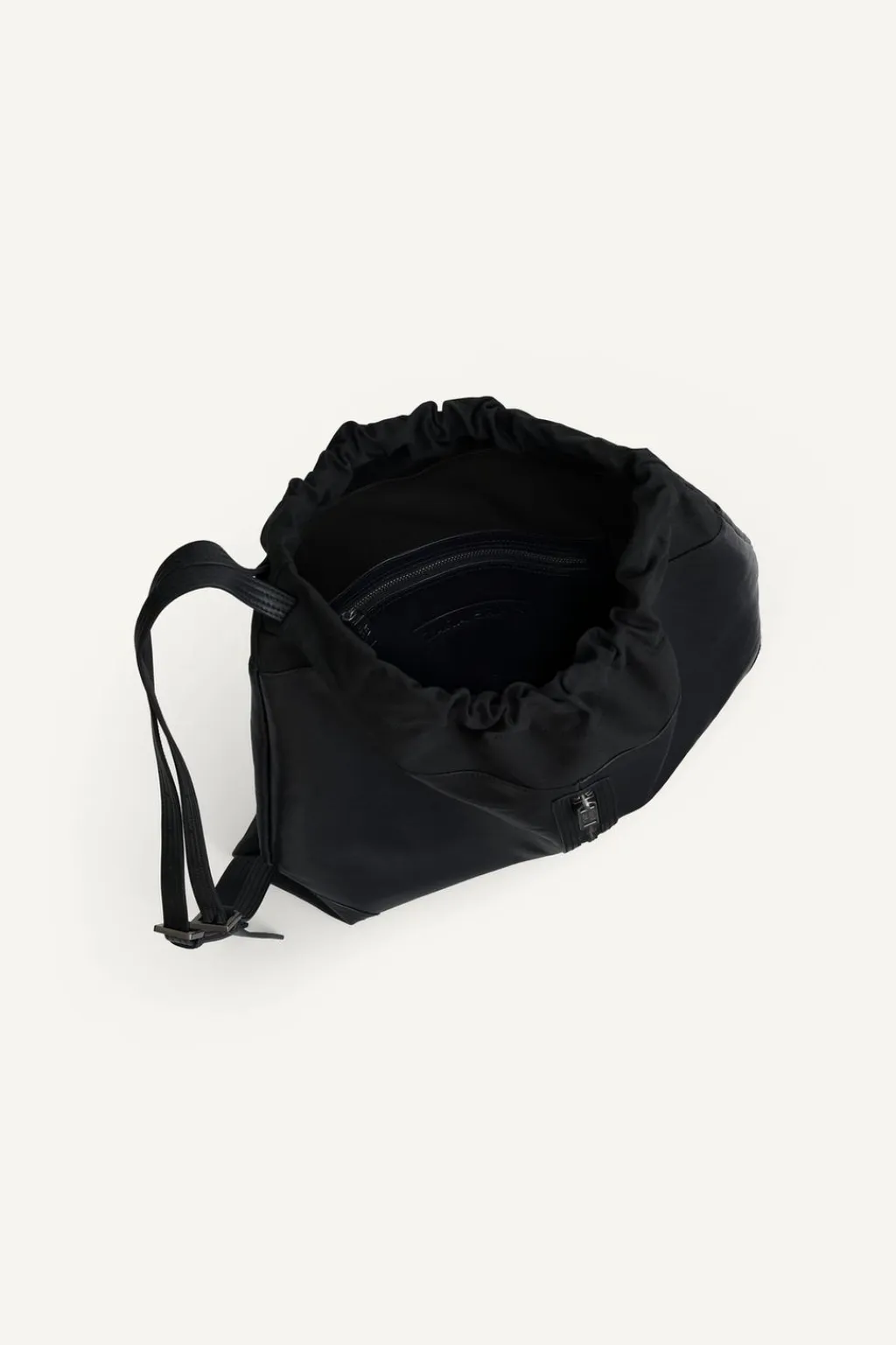 Mochila fabricada en piel. Compartimento principal con cierre mediante cordón ajustable en la parte superior y cremallera en la parte frontal. El interior cuenta con un bolsillo plano y un bolsillo de piel con cierre mediante cremallera. Cuenta con un asa de hombro ajustable dividida en dos.