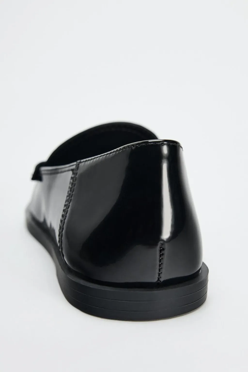 Zapato plano tipo mocasín. Efecto acharolado. Detalle de fruncido en la parte delantera. Copete subido y antifaz.