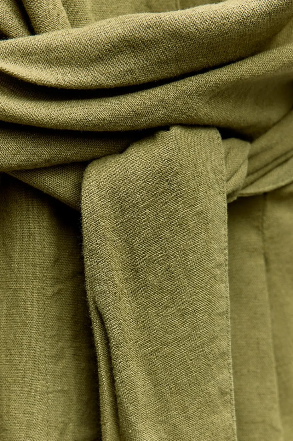 Mono confeccionado con lino. Cuello solapa con escote pico cruzado y manga sisa. Detalle de cinturón del mismo tejido. Pernera ancha. Cierre frontal con cremallera y botones.