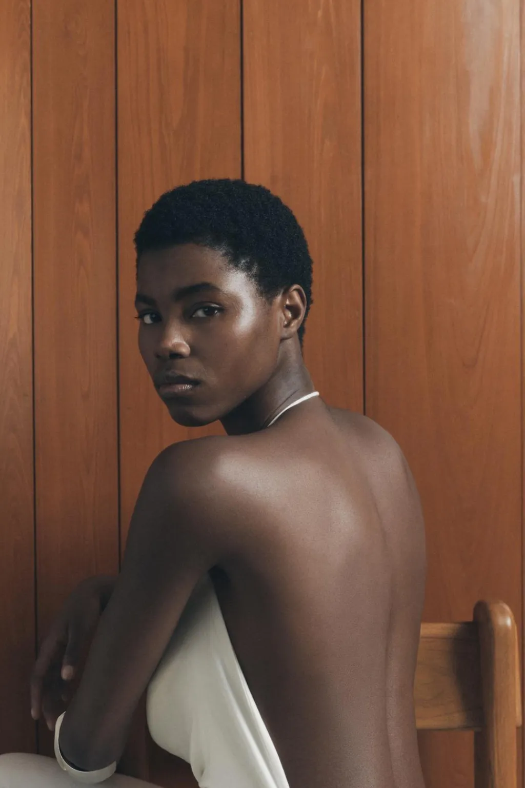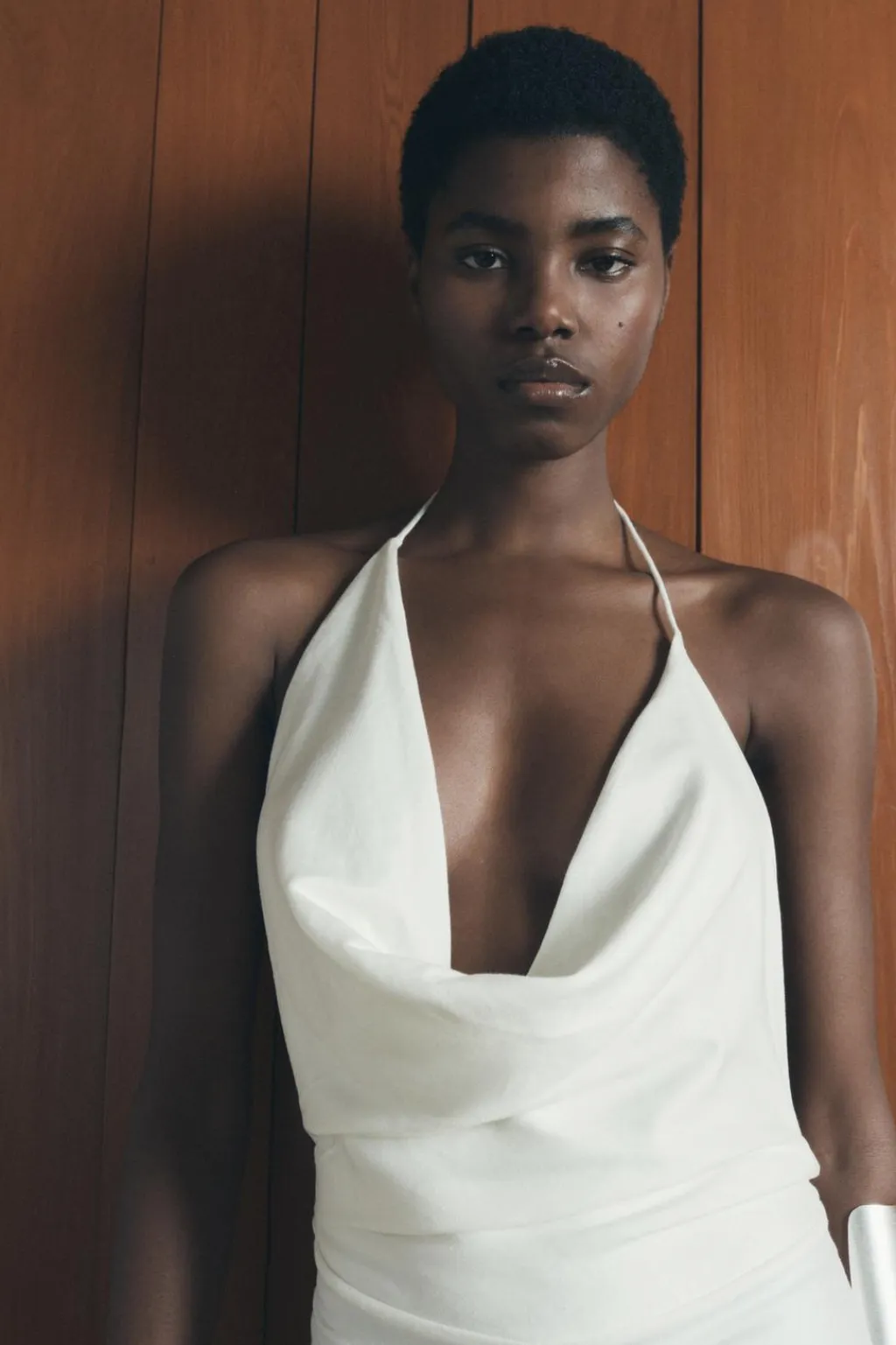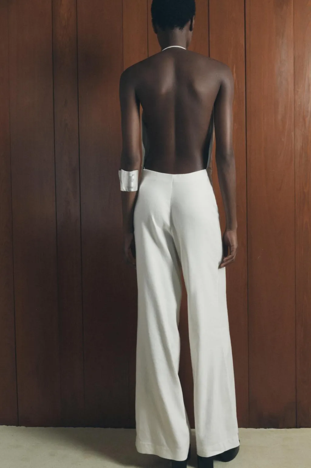 Mono largo confeccionado en hilatura con lino 27%. Escote fluido y cuello halter. Pierna ancha. Cierre lateral con cremallera oculta en costura.