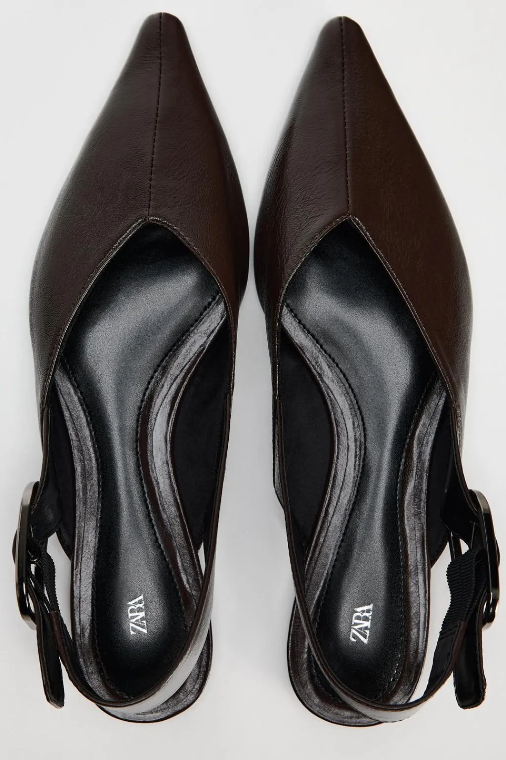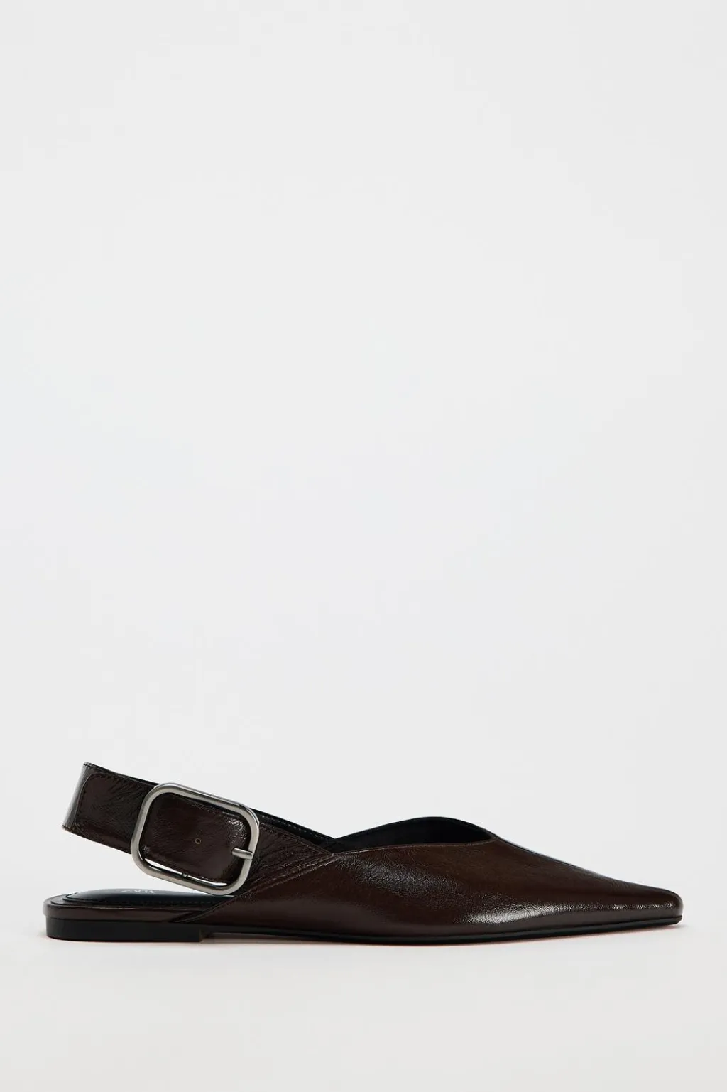 Zapato plano tipo mule en piel. Acabado en punta. Tira trasera con hebilla al tobillo.