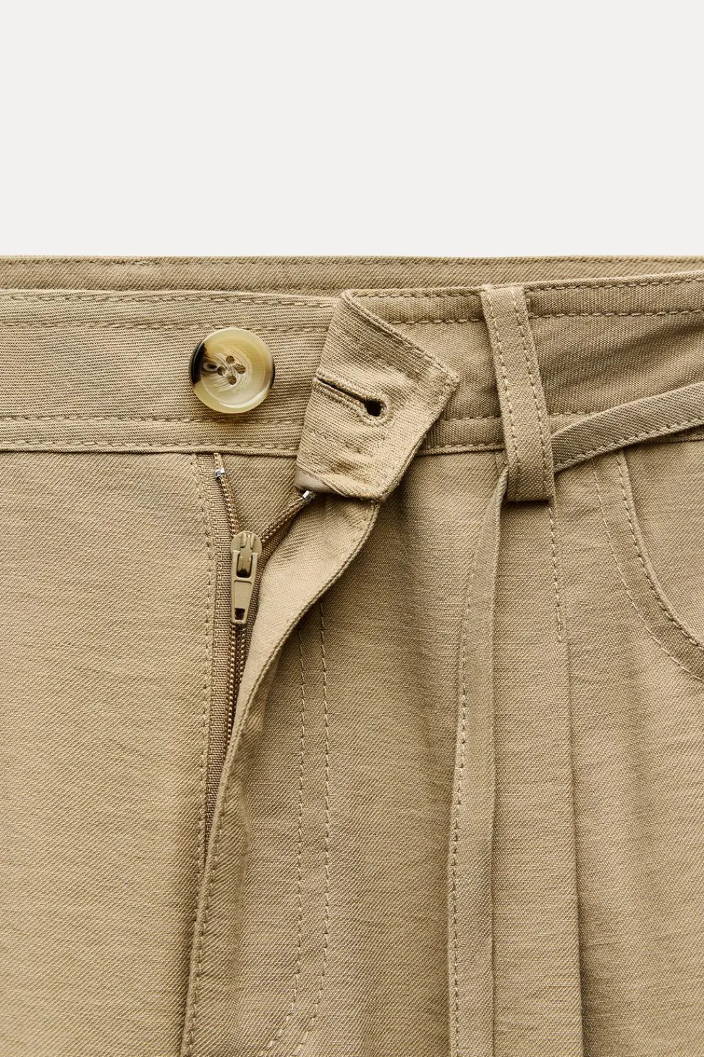 Pantalón de tiro alto con pinzas y cinturón fino. Bolsillos delanteros y bolsillos de plastrón en espalda. Pernera ancha. Cierre frontal con cremallera y botón.