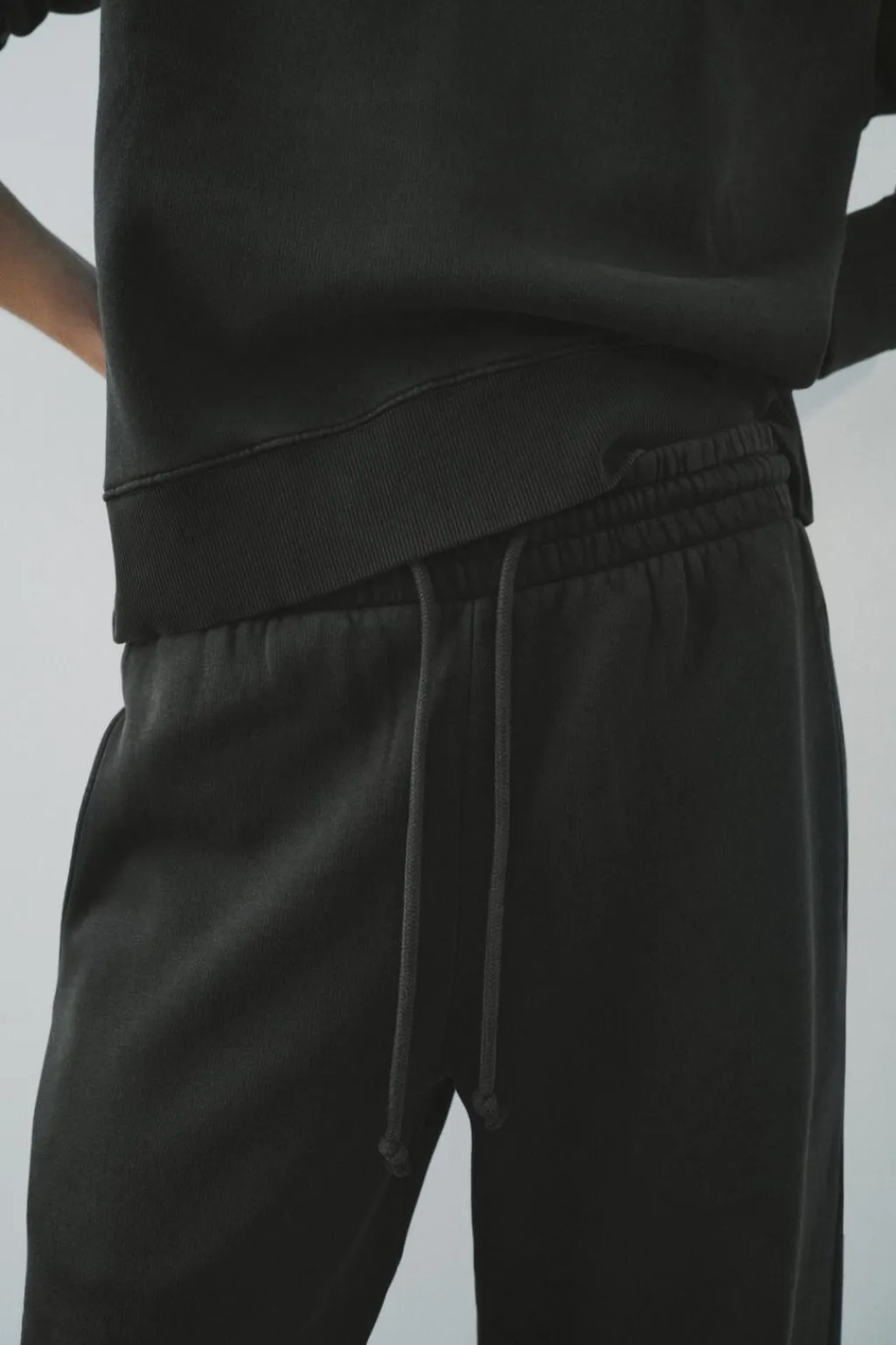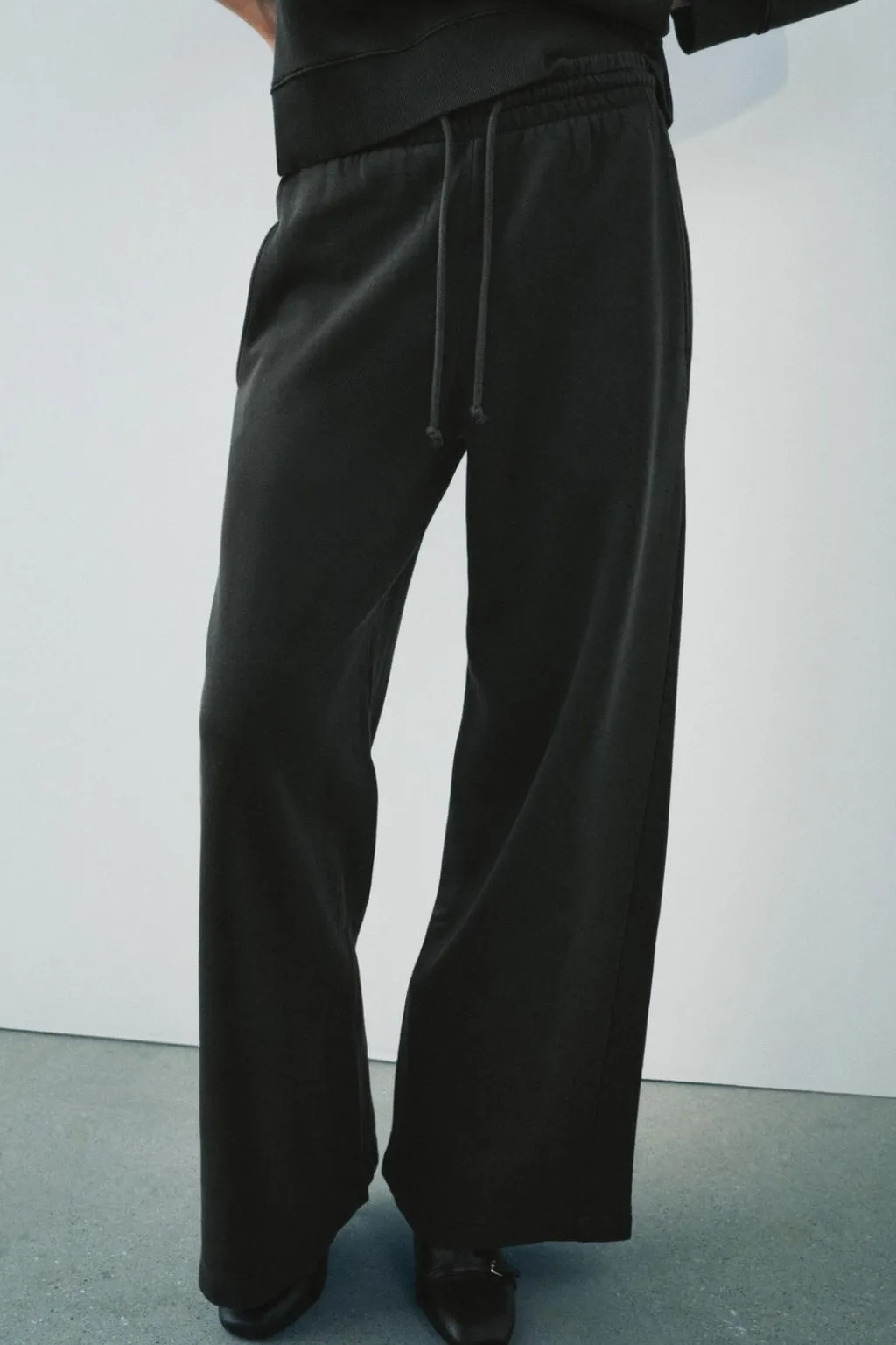 Pantalón confeccionado en hilatura con mezcla de algodón. Tiro medio y cintura ajustable con cordones. Bolsillos laterales. Pierna ancha.