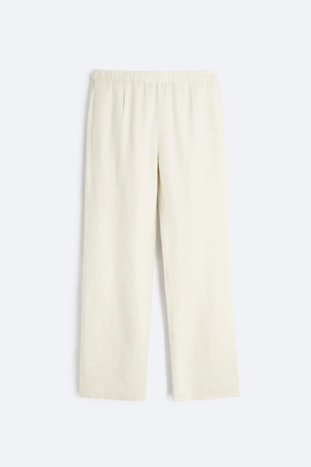 Pantalón relaxed fit confeccionado en tejido de lino. Cintura elástica ajustable con cordóninterior y detalle de pliegues frontales. Bolsillos en delantero y detalle de bolsillo trasero de vivo.