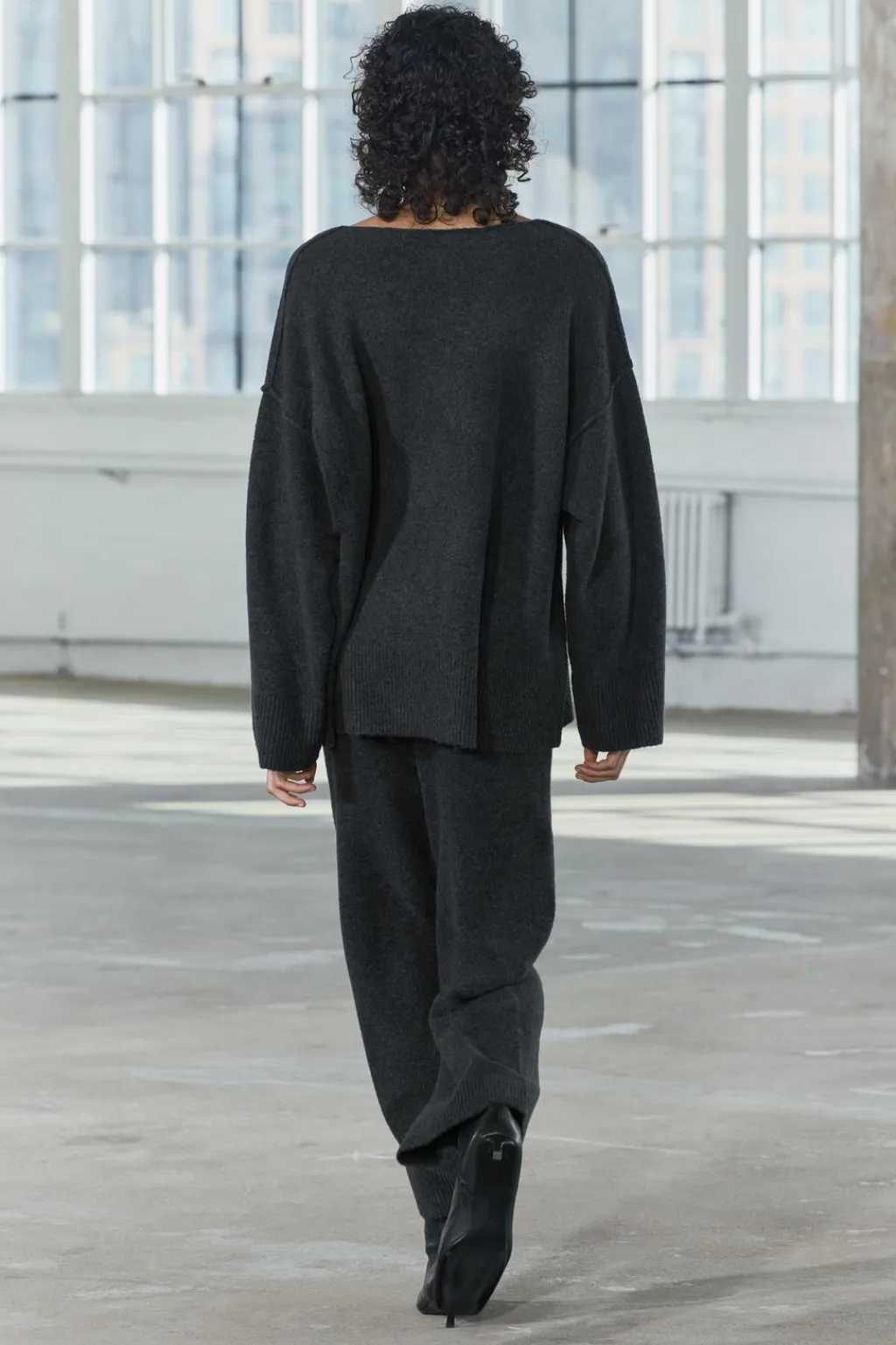Pantalón de punto liso. Tiro alto con cintura elástica y pernera ancha. Acabados en rib.