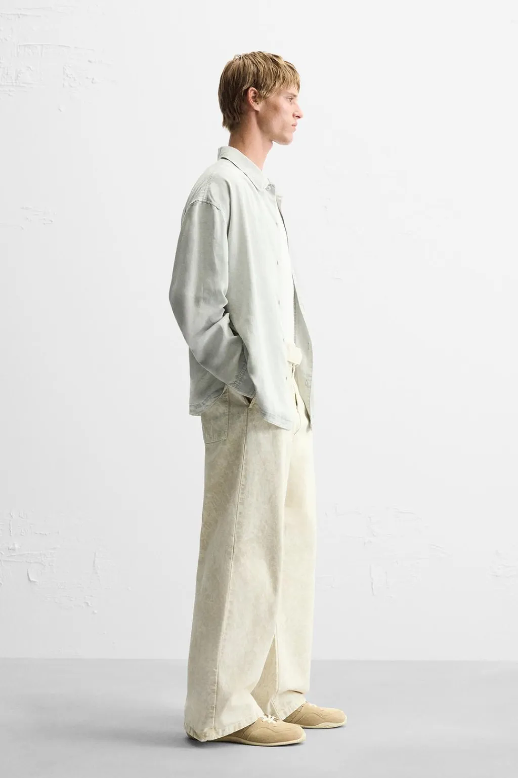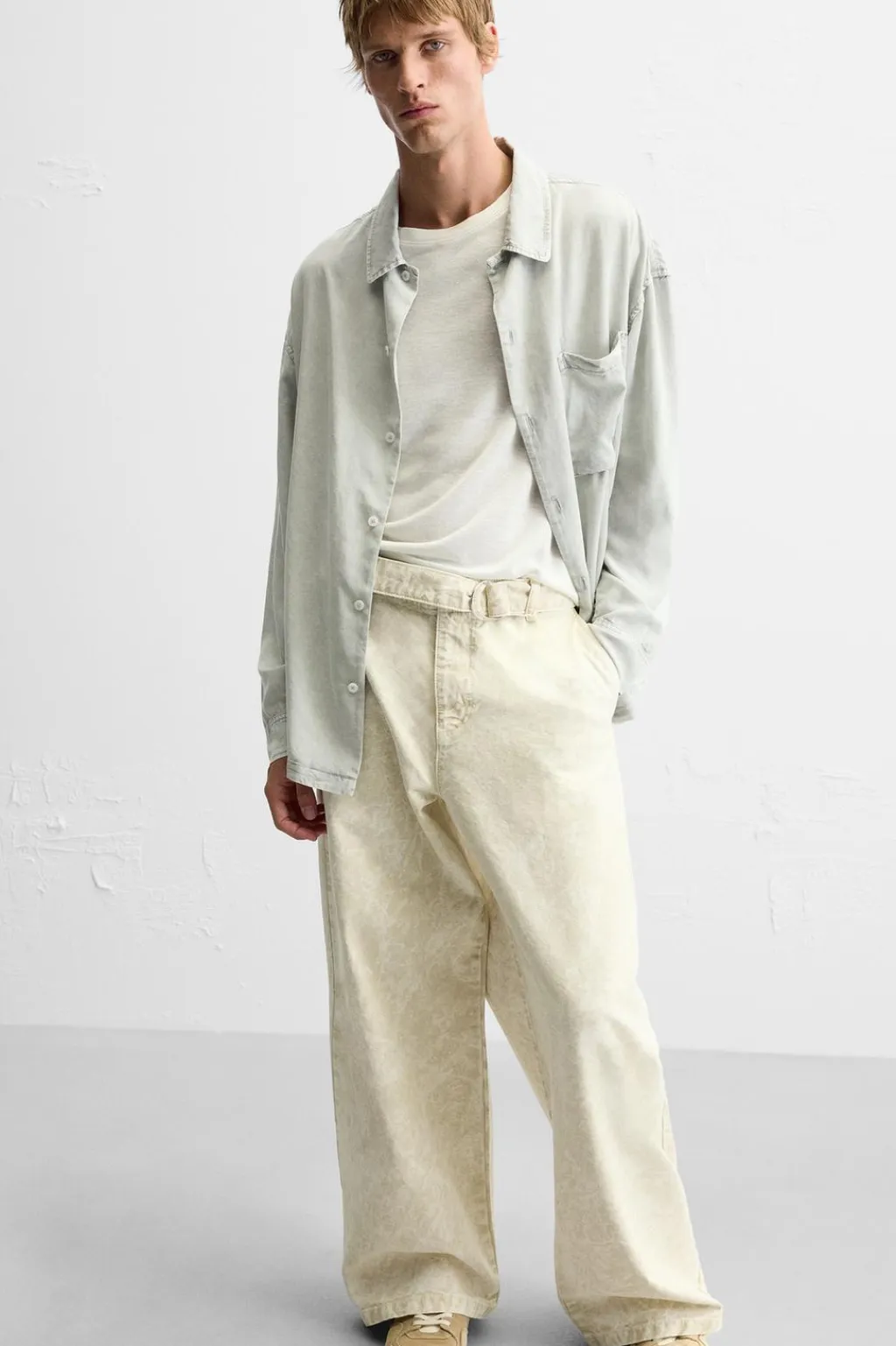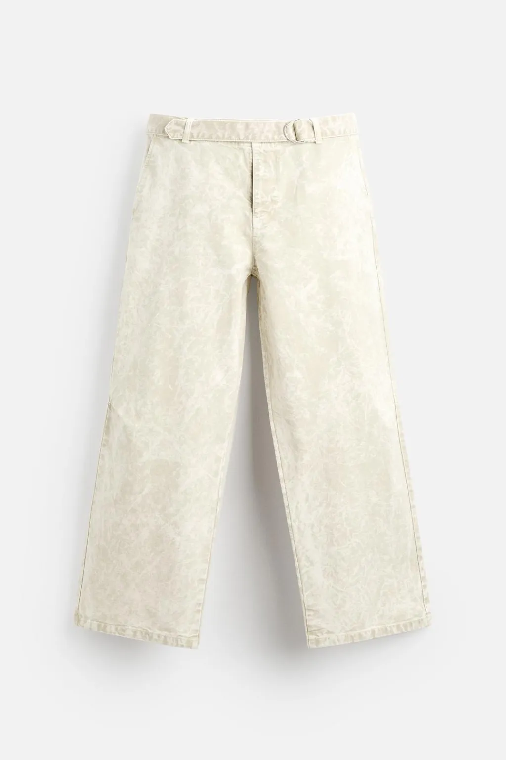 Pantalón relaxed fit. Cintura con detalle de cinturón del mismo tejido. Bolsillos delanteros y detalle de bolsillos trasero de plastrón. Efecto lavado. Cierre frontal con cremallera y botón.