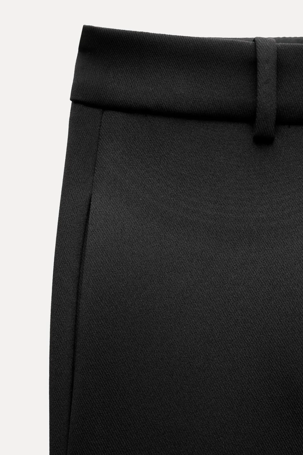 Pantalón de tiro medio y cintura con trabillas. Bajo acabado en línea evasé. Cierre frontal con cremallera, botón y gancho metálico.