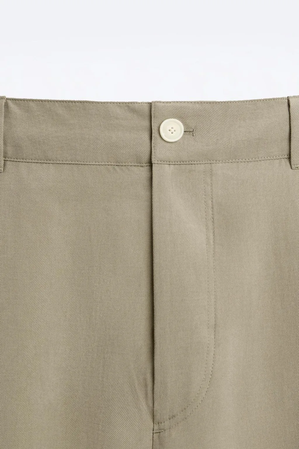 Pantalón relaxed fit confeccionada en tejido con mezcla de lyocell. Cintura con pliegues frontales y detalle de bolsillos traseros. Cierre frontal con creamllera y botón.