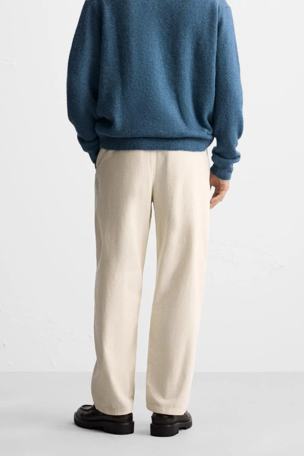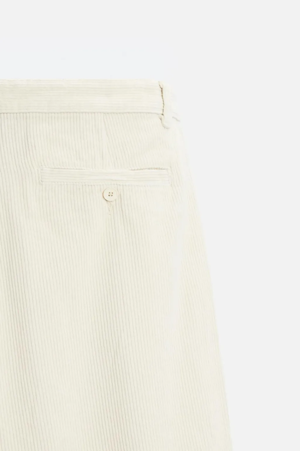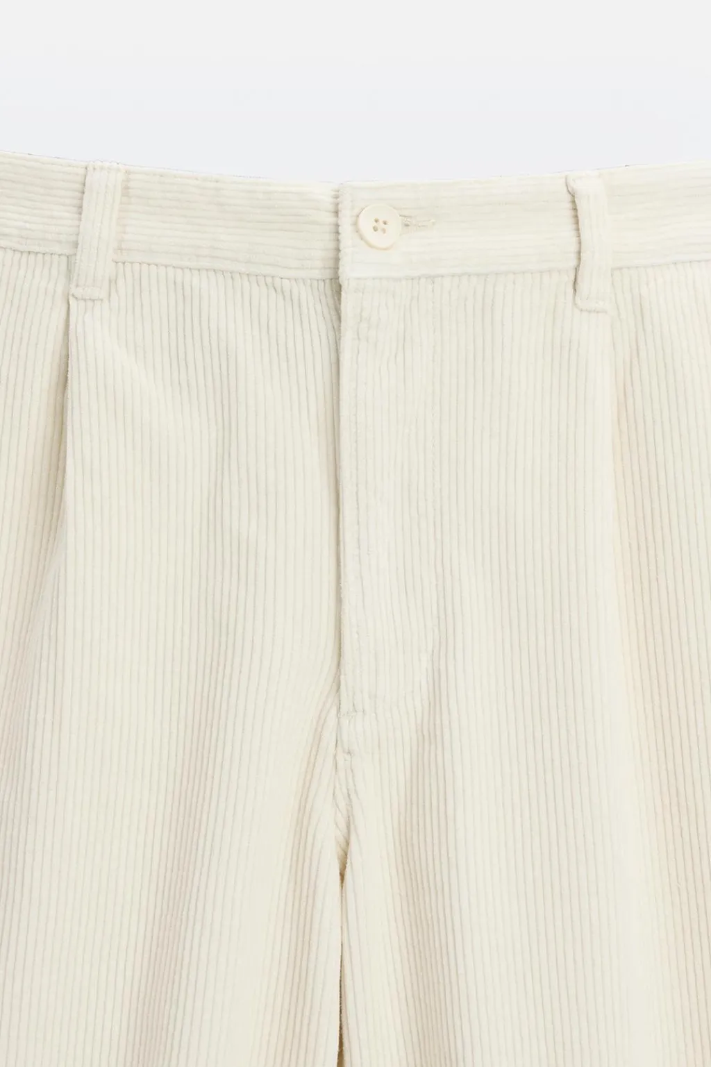 Pantalón relaxed fit confeccionado en pana de algodón. Cintura con detalle de pliegues en delantero. Bolsillos frontales y detalle de bolsillos traseros de vivo con botón. Cierre frontal con cremallera.