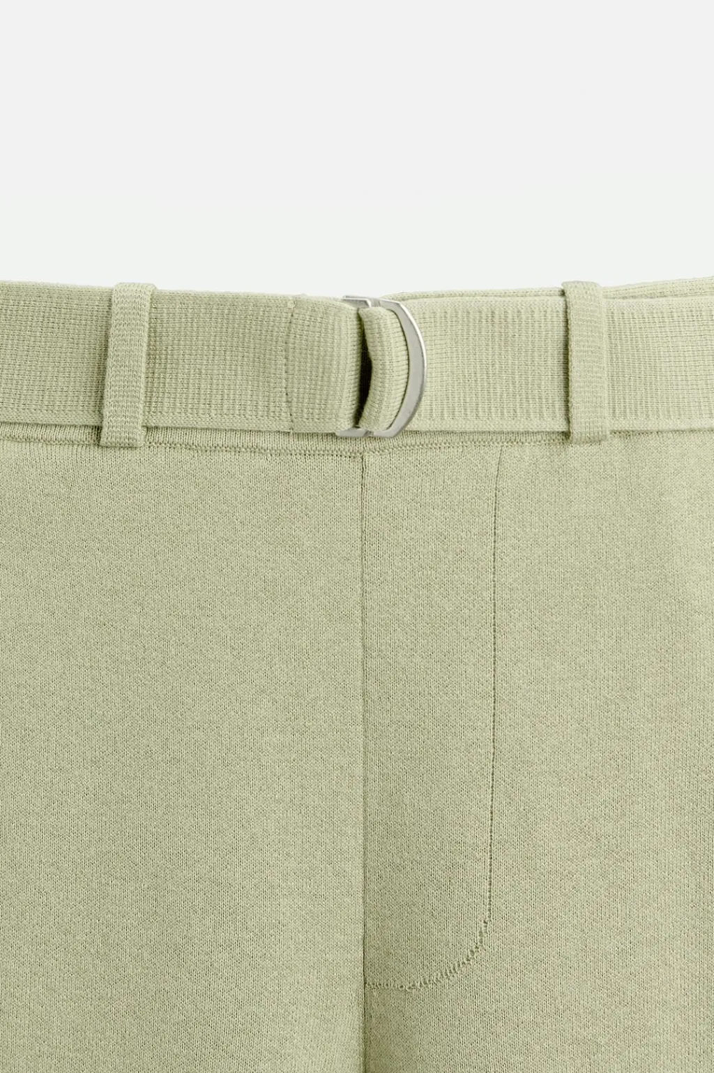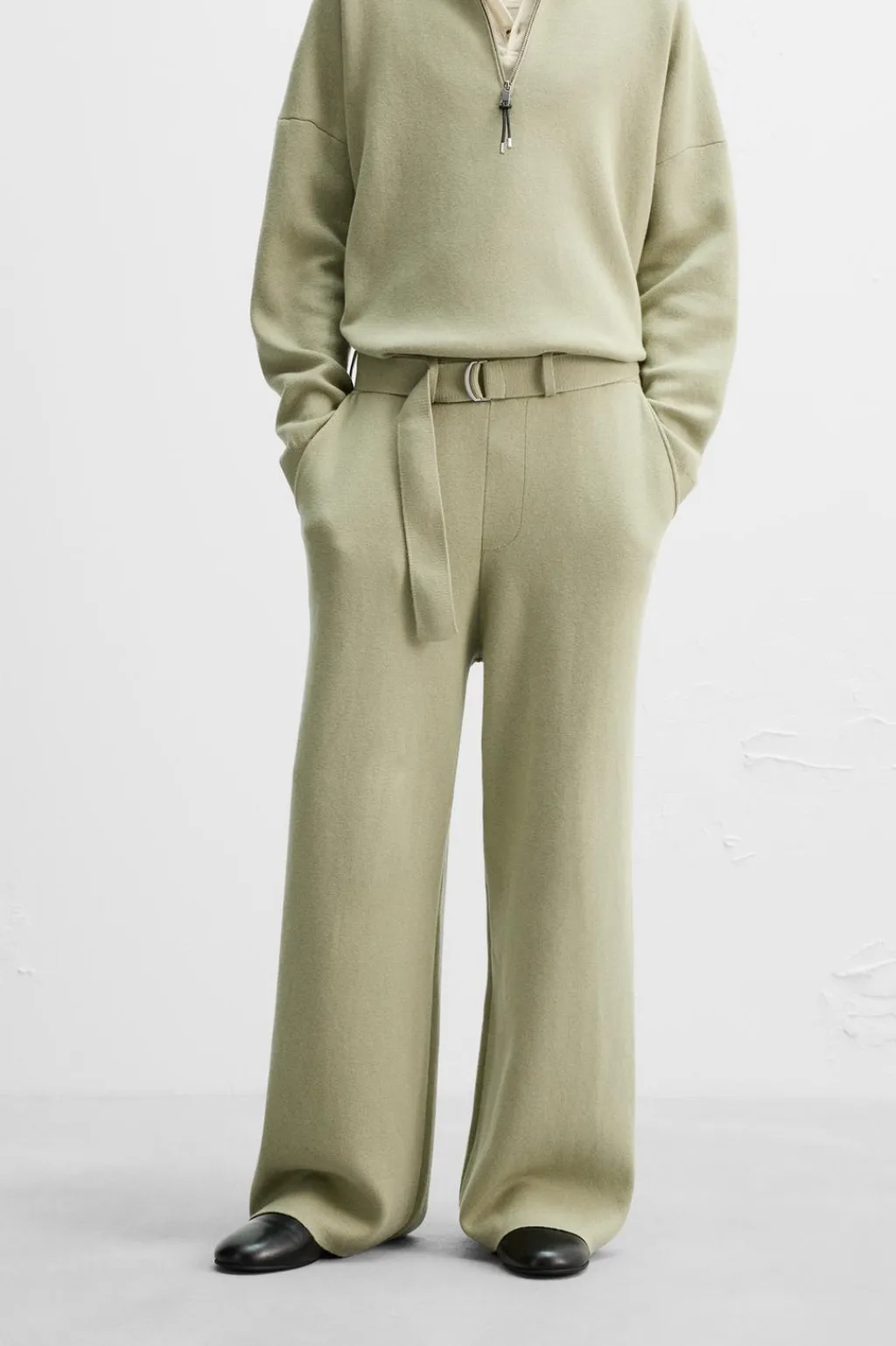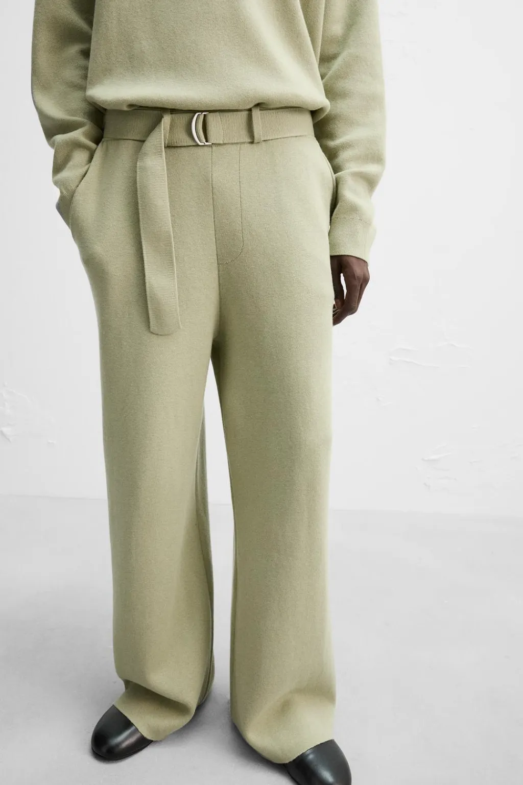 Pantalón relaxed fit de punto tejido en hilatura con mezcla de algodón y lana. Cintura elástica ajustable con cinturón. Bolsillos frontales y detalle de bolsillos traseros de plastrón.