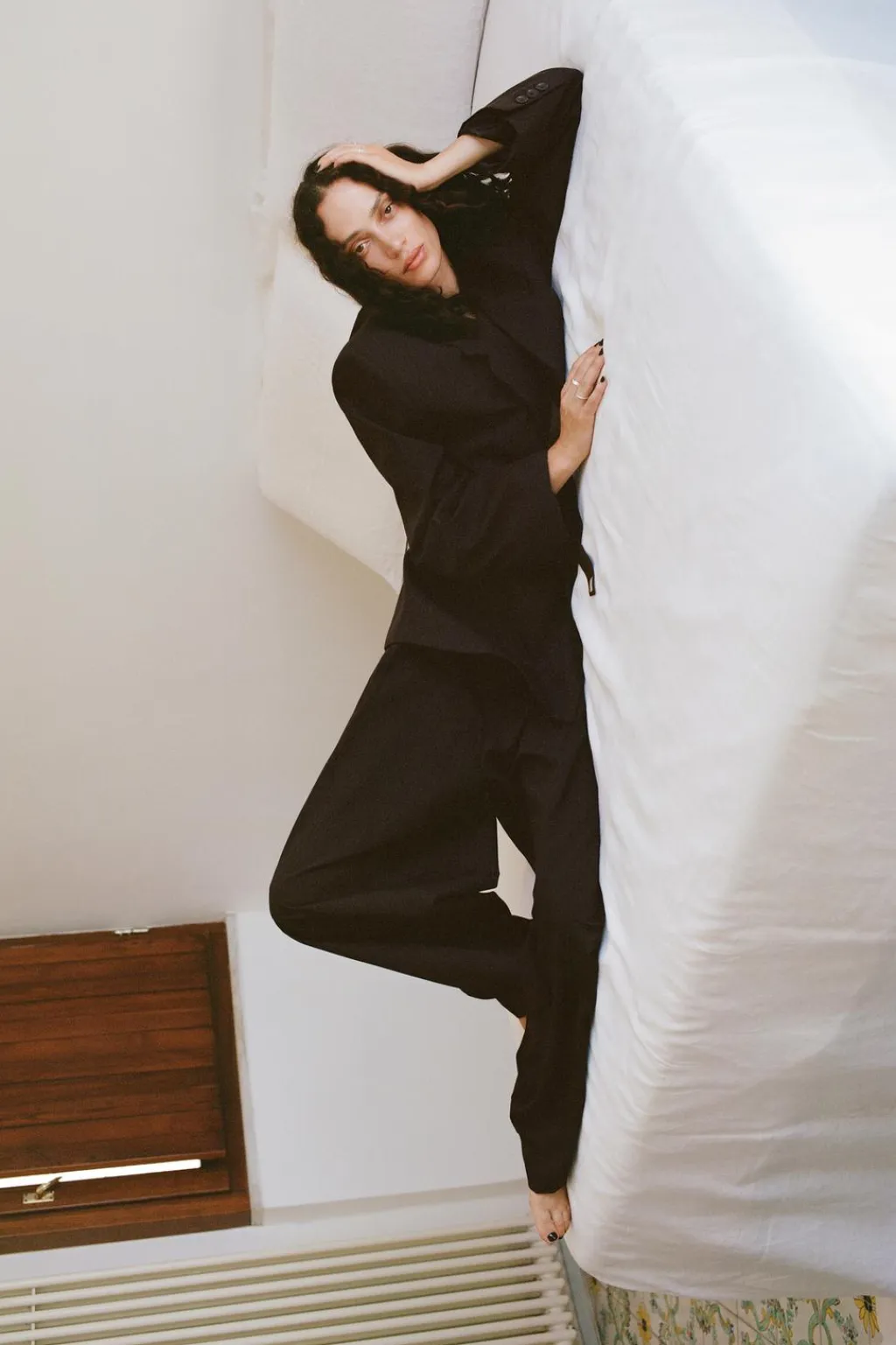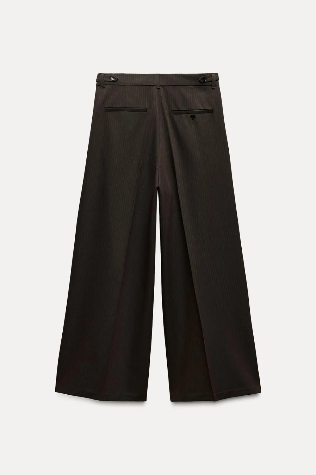 Pantalón de tiro alto con trabillas. Bolsillos laterales y falsos bolsillos de vivo en espalda. Detalle de pinzas en delantero. Cierre frontal con cremallera, botón interior y gancho metálico.