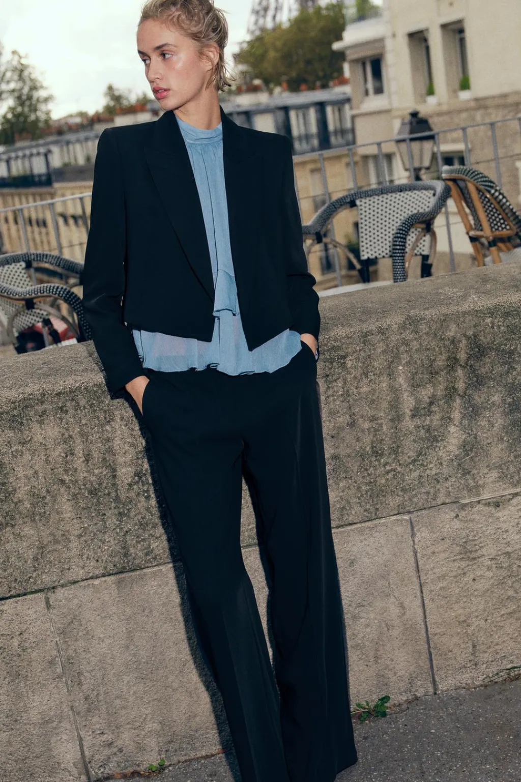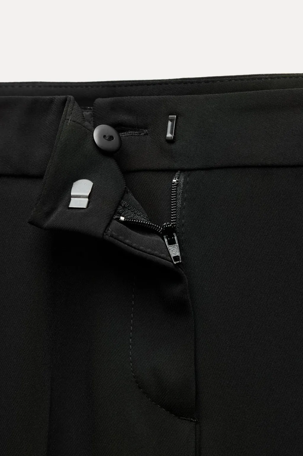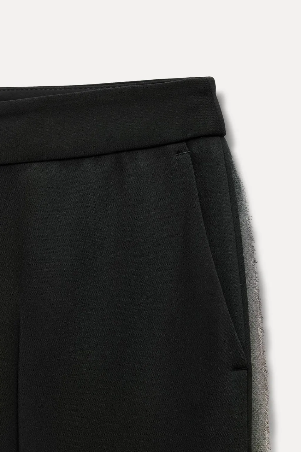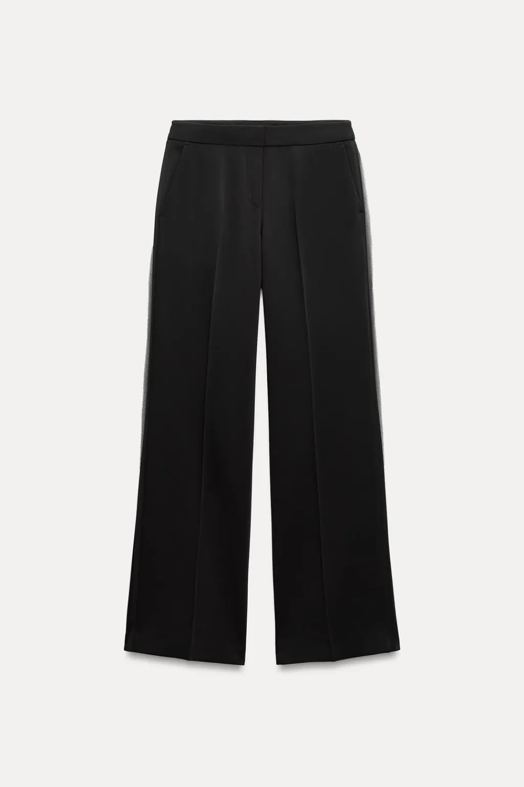 Pantalón de tiro medio con bolsillos delanteros y falsos bolsillos de vivo en espalda. Pernera recta. Detalle de banda lateral con tejido combinado semitransparente. Cierre frontal con cremallera, botón interior y gancho.