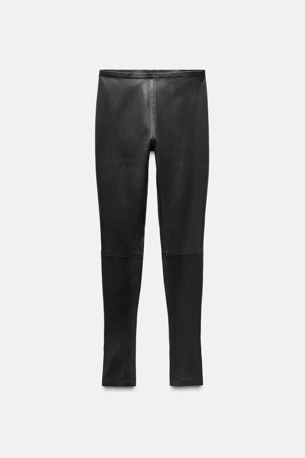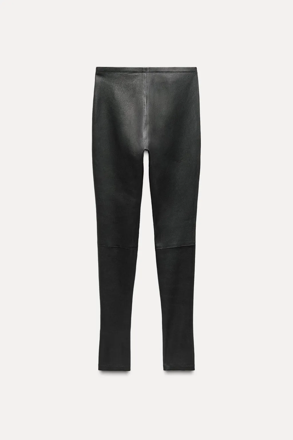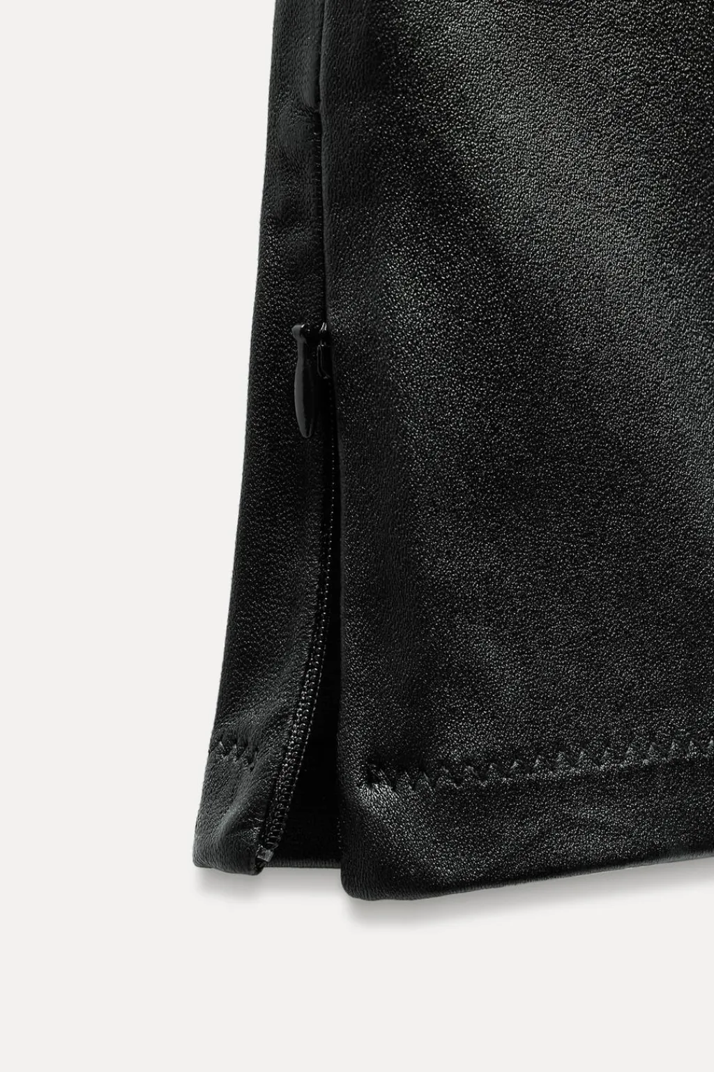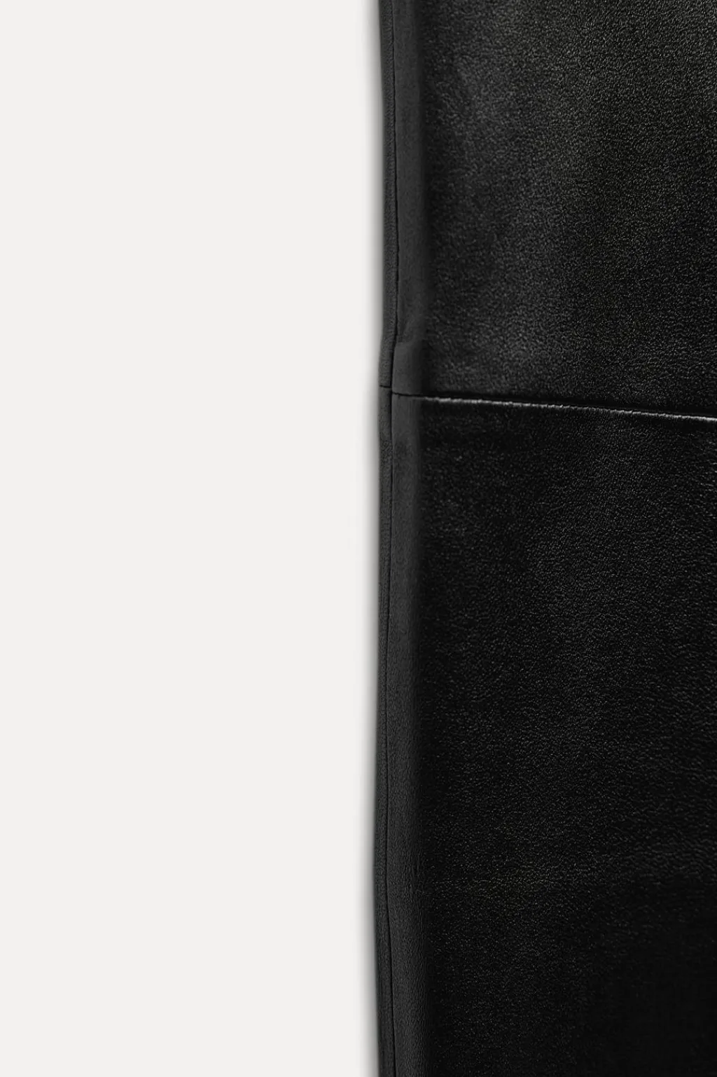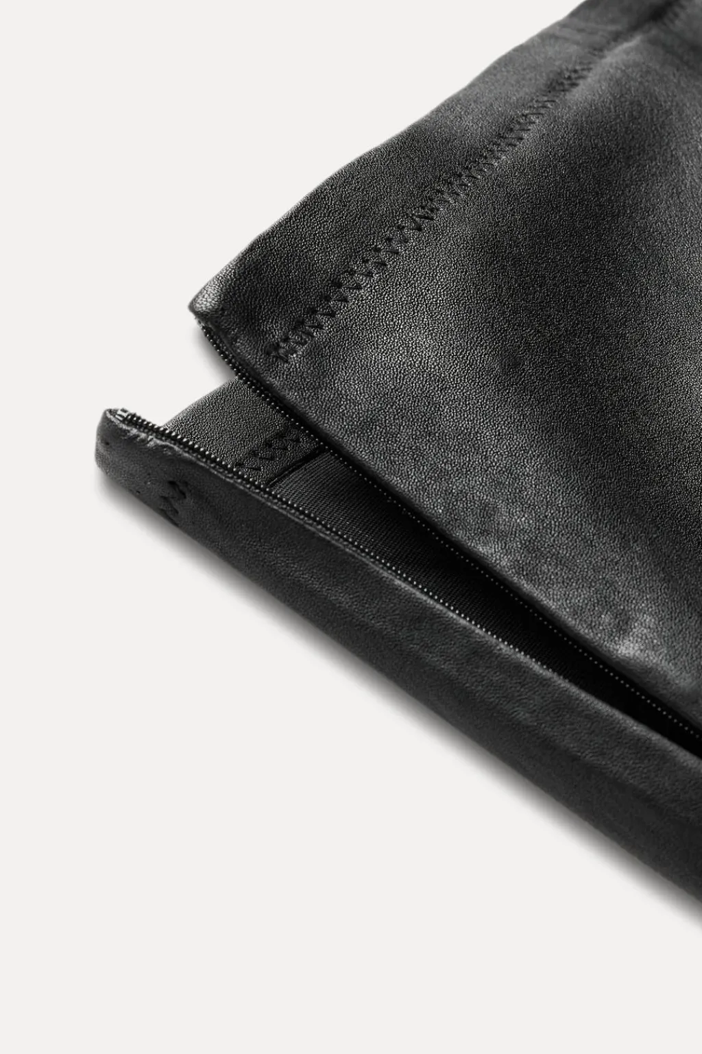 Pantalón confeccionado en piel 100%. Tiro alto con cremallera oculta en costura. Bajo acabado con cremallera lateral oculta en costura.