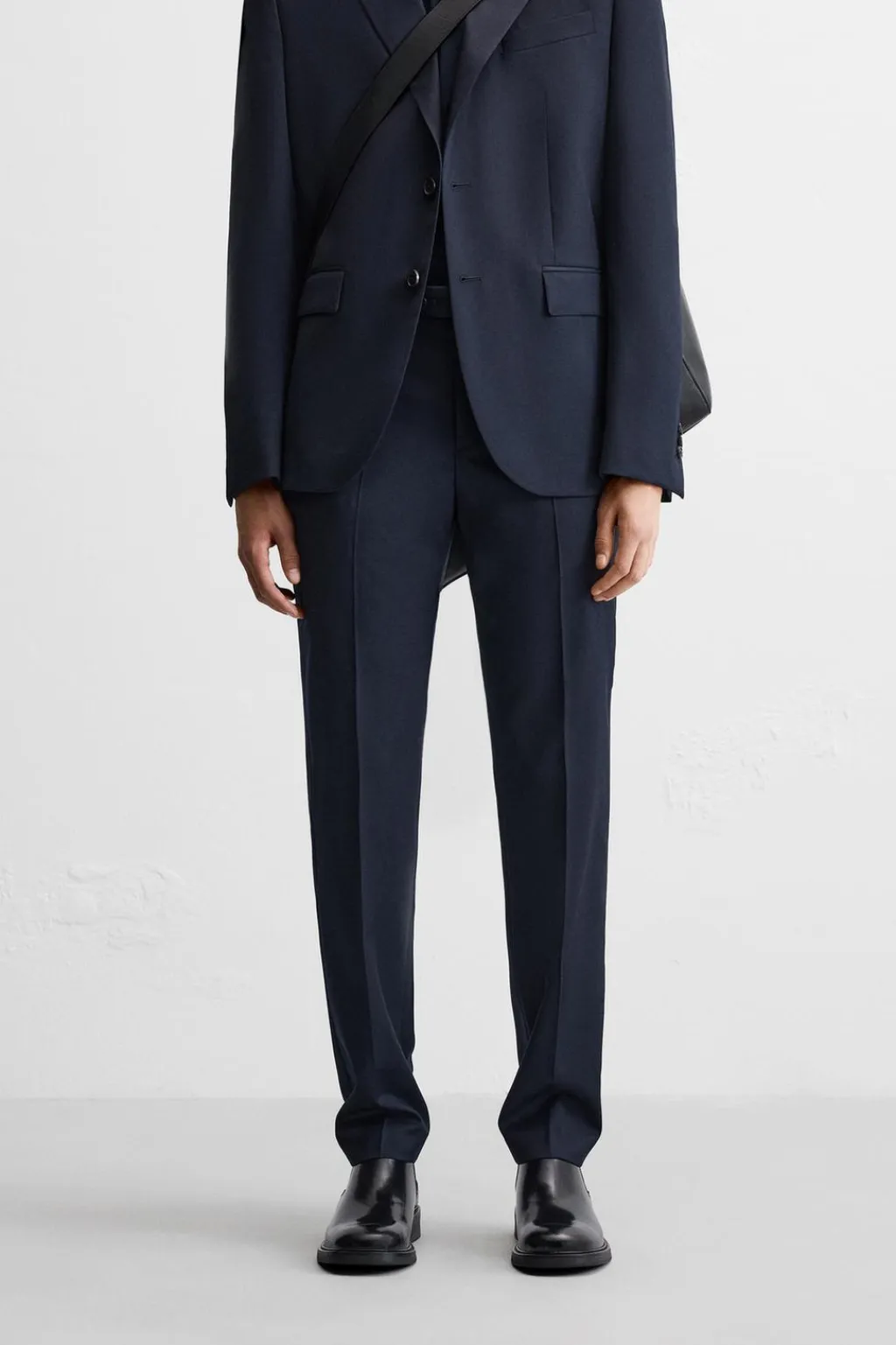Pantalón slim fit confeccionado en tejido de lana italiana. Bolsillos frontales y detalle de bolsillos traseros de doble vivo con botón. Cierre frontal con cremallera y botón cruzado.