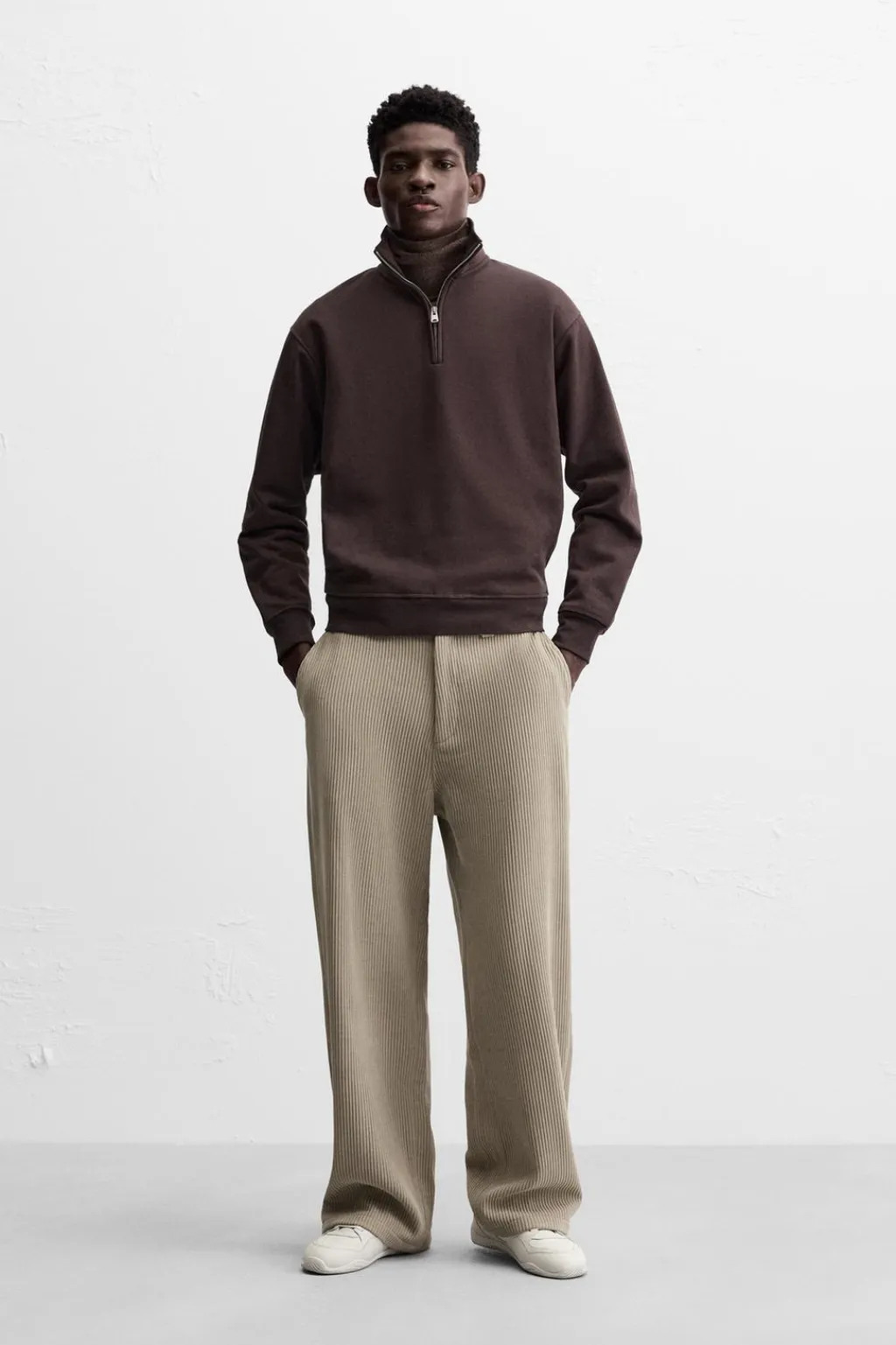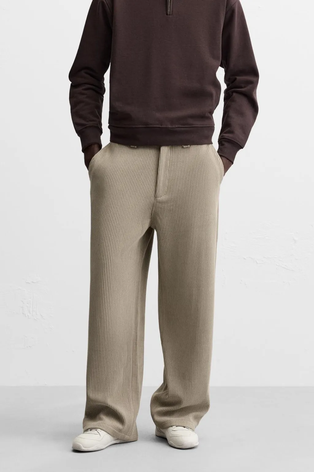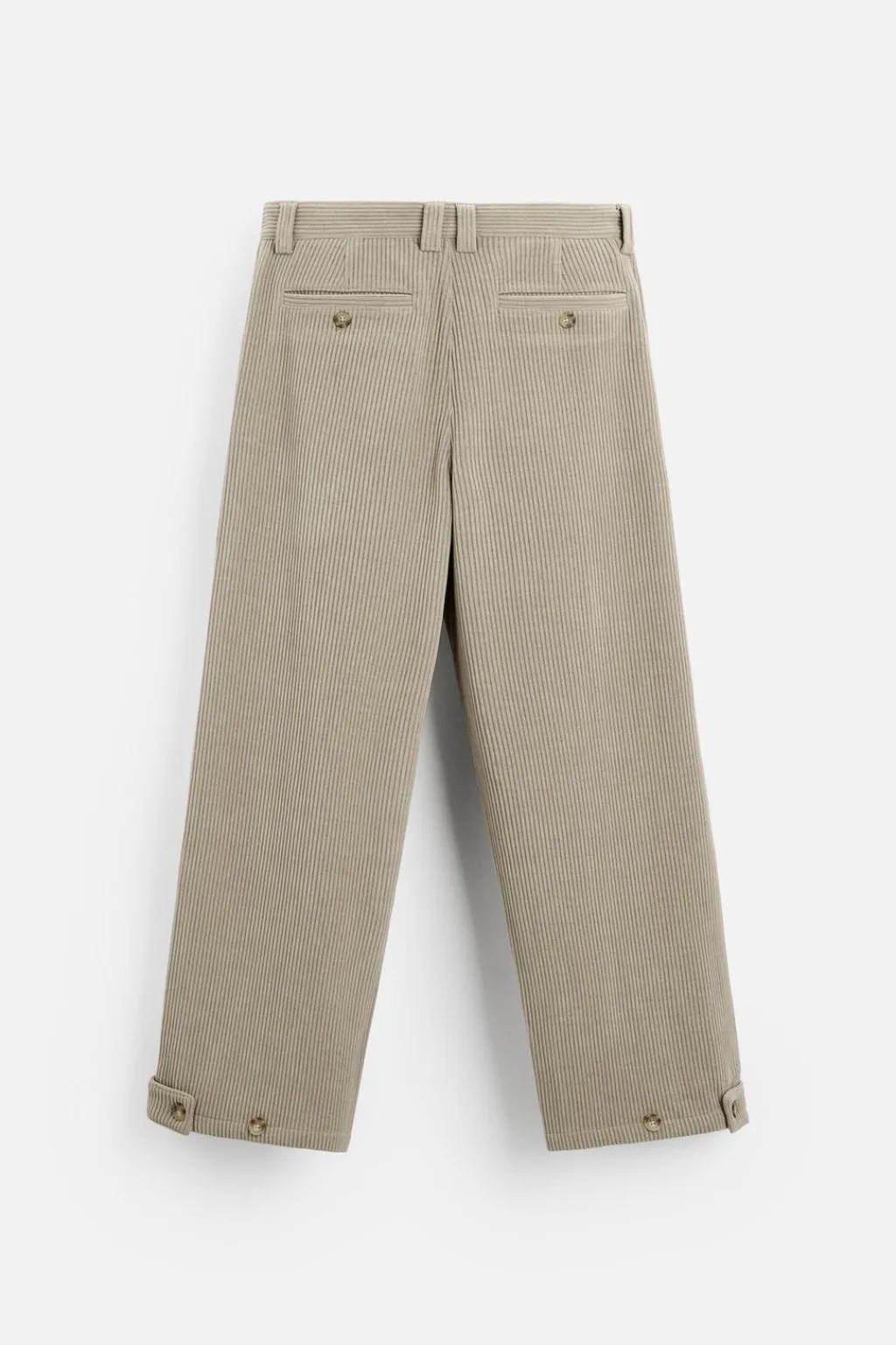 Pantalón wide fit confeccionado en tejido de pana. Bolsillos delanteros y detalle de bolsillos traseros de vivo. Bajo ajustable mediante botones. Cierre frontal de cremallera y botón.