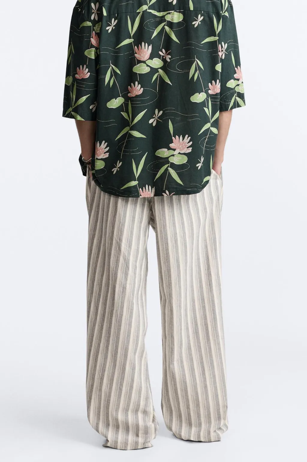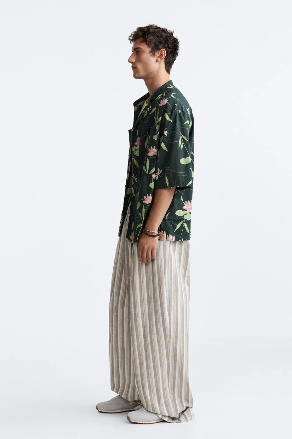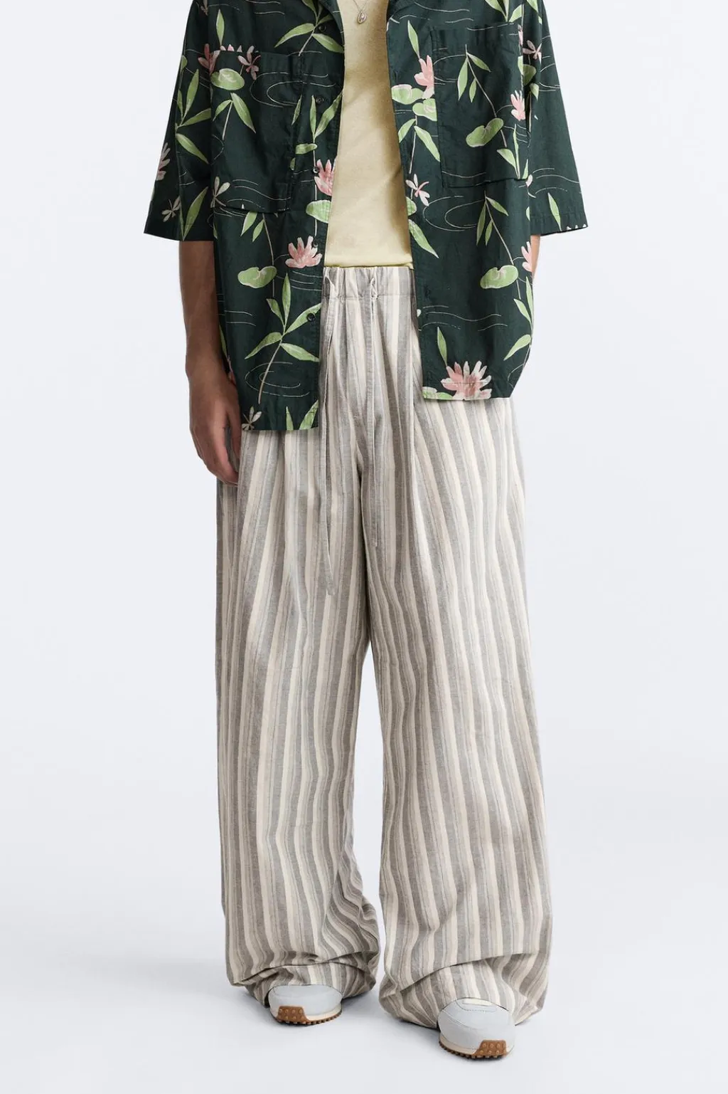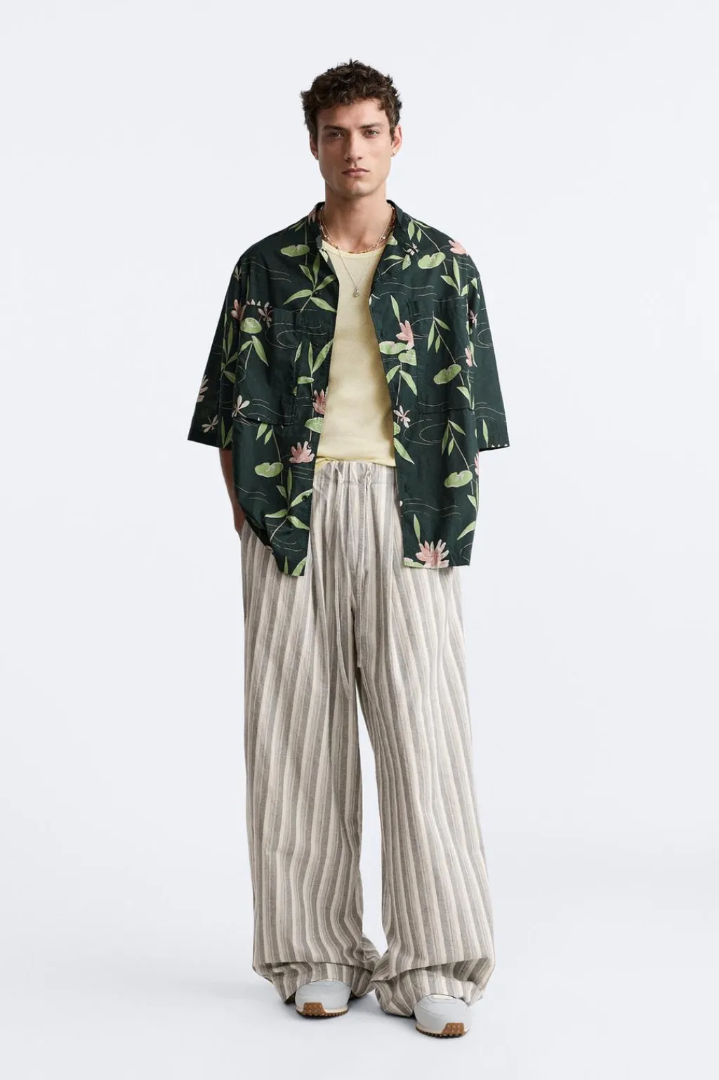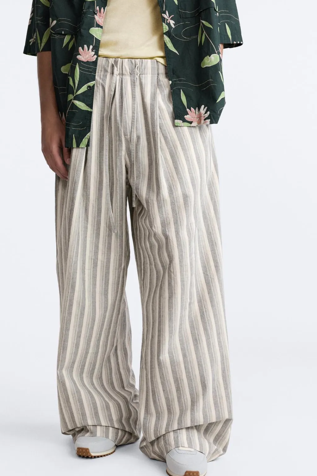 Pantalón wide fit confeccionado en tejido de algodón. Cintura elástica ajustable con cordón y detalle de pliegues frontales. Bolsillo laterales y bolsillo trasero de plastrón.