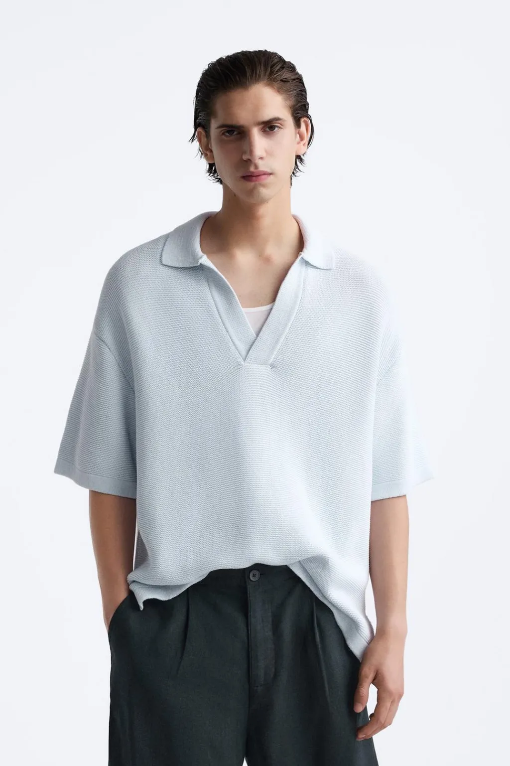 Polo tejido en hilatura de algodón. Cuello solapa con abertura frontal y manga corta. Bajo con aberturas laterales. Acabados en rib.