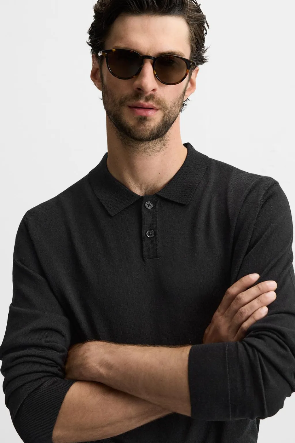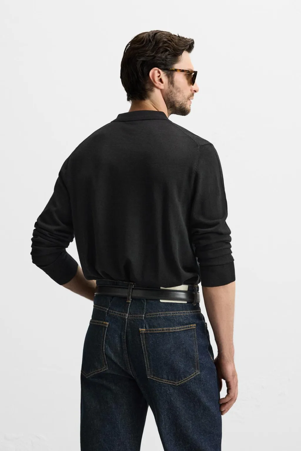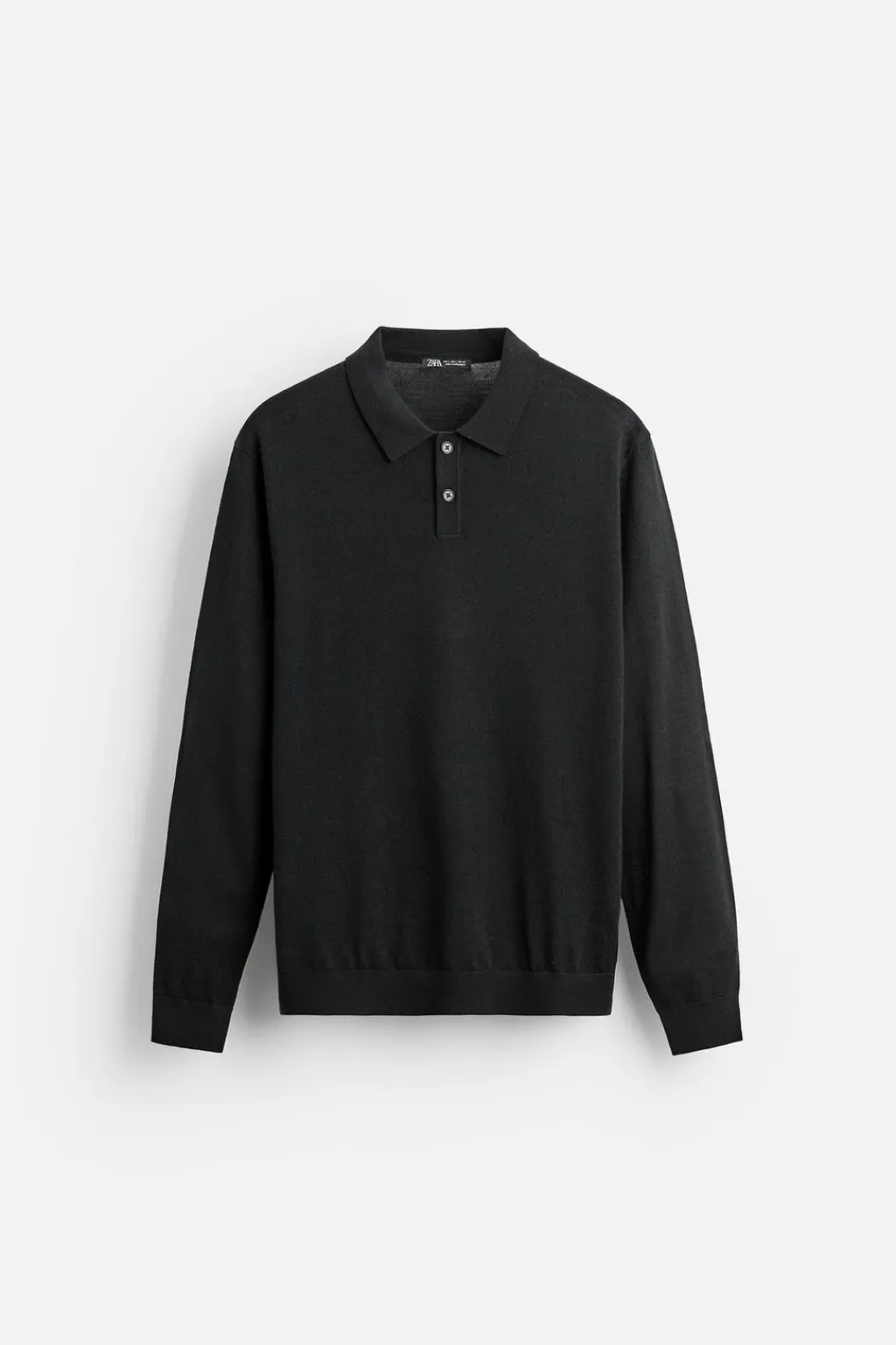 Polo regular fit de punto tejido en hilatura de lana merino. Cuello solapa con cierre frontal de botonadura y manga larga. Acabados en rib.