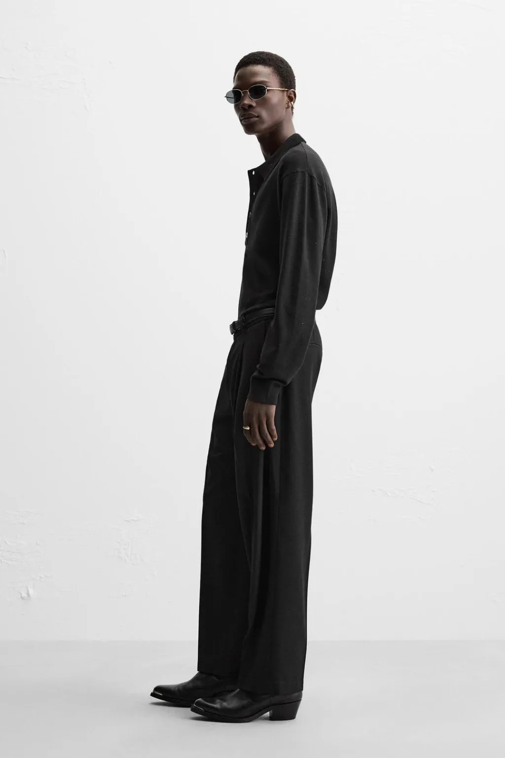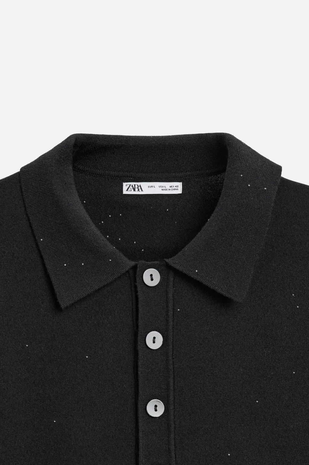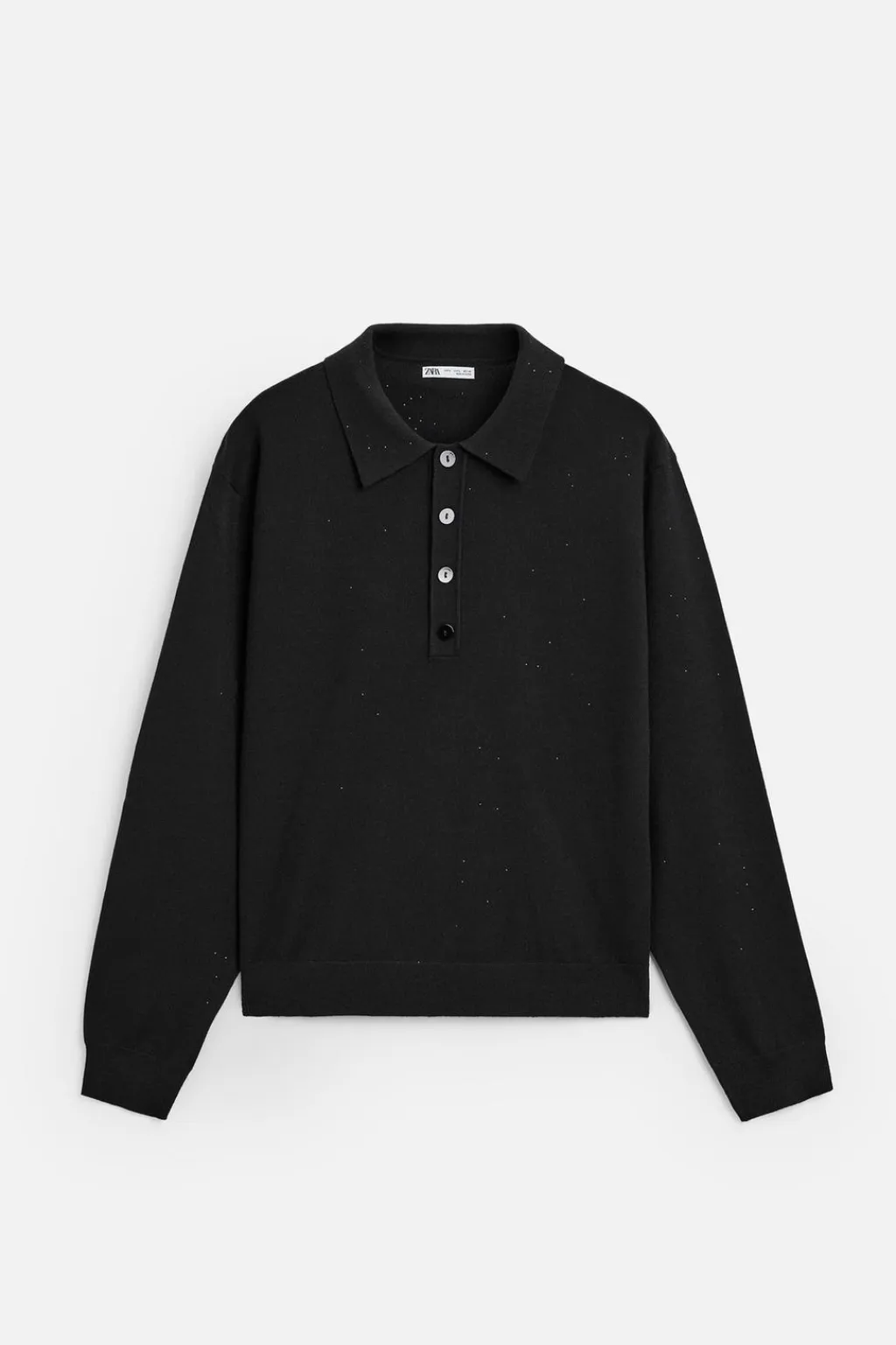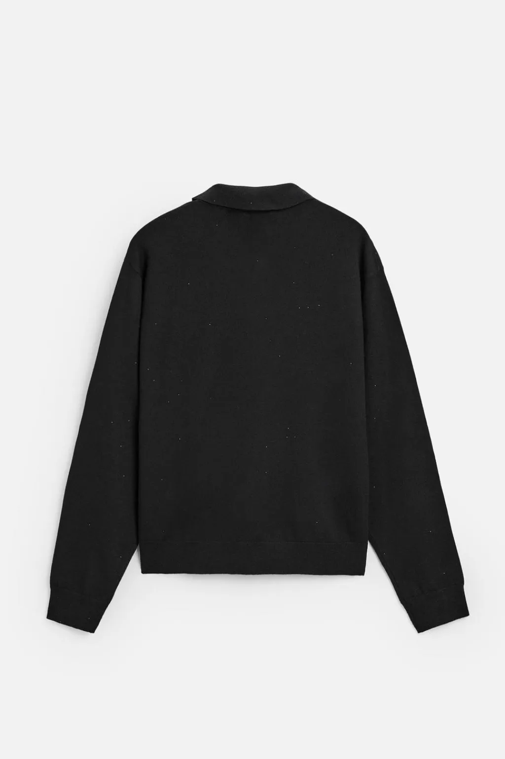 Polo de punto relaxed fit tejido en hilatura con lentejuelas. Cuello solapa con cierre frontal de botonadura. Manga larga. Acabados en rib.